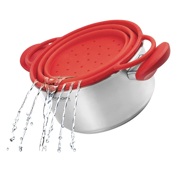 Внутренние отметки литража, Многофункциональный складной дуршлаг: можно использовать, как подставку под горячее, дуршлаг, вкладку-пароварку, крышку для слива жидкости