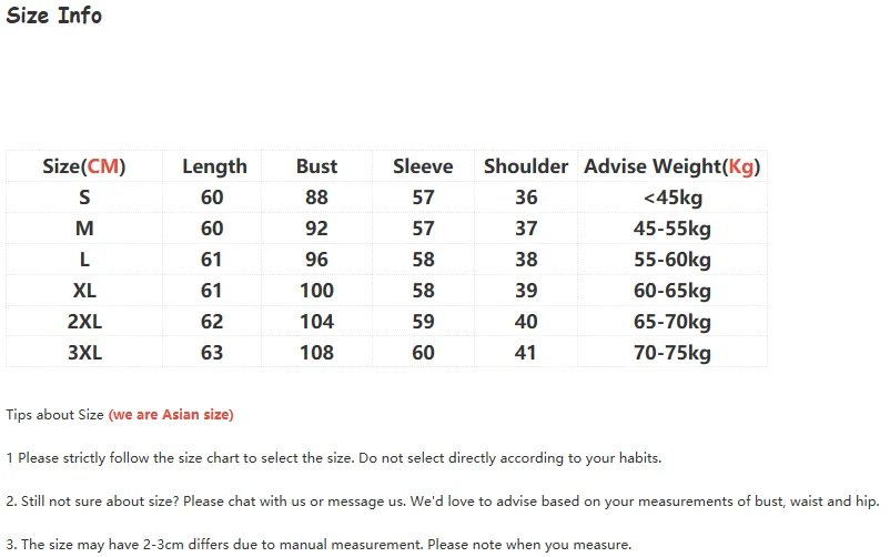 Размеры (См) Длина Обхват груди Рукава Сумка на плечо Посоветуйте Вес (Кг) S 60 88 57 36 <45 кг М 60 92 57 37 45-55 кг L 61 96 58 38 55-60 кг XL 61 100 58 39 60-65 кг 2XL 62 104 59 40 65-70 кг 3XL 63 108 60 41 70-75 кг
