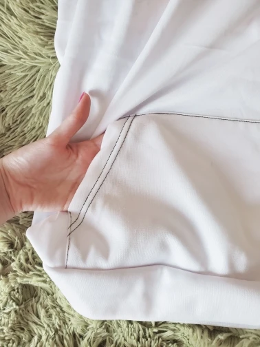 as other reviewers have mentioned, the hoodie does have black stitching which isnt how the review pictures appeared. but it gives it a cartoony outline look which i dont mind. its also made of a slightly shiny polyester material but has a soft felt lining on the inside. the hood is also quite small so its not very flattering to wear with it on. i also thought a M size would be more oversized based on the measurements so definitely size up!! overall im quite happy.