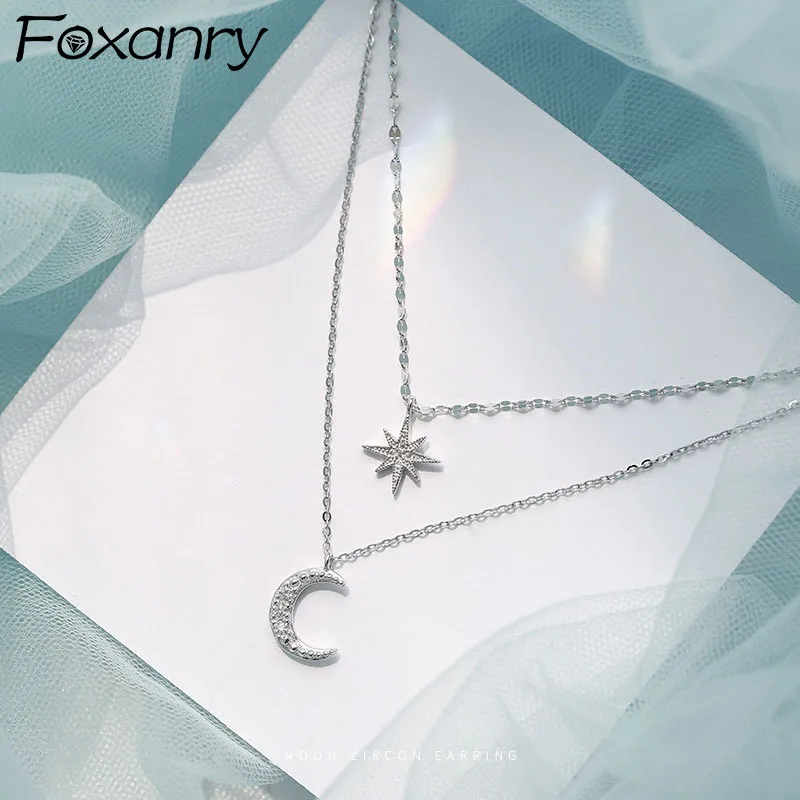 Цепочка Foxanry с подвеской-штампом для женщин, ожерелье с подвеской в виде блестящей Луны и звезды, ювелирное изделие до ключицы, подарок для невесты, 925