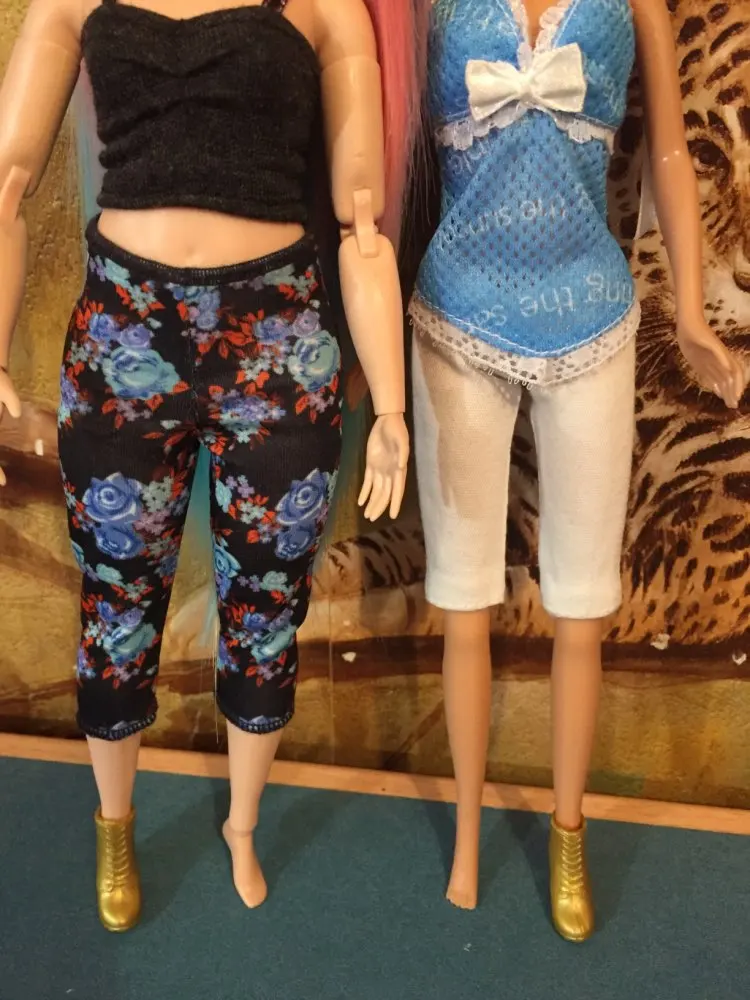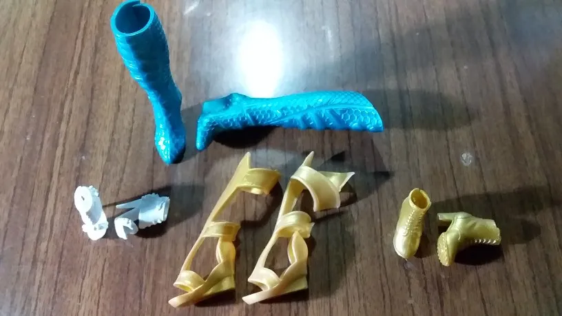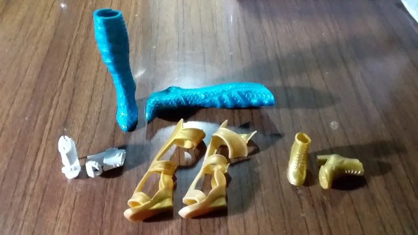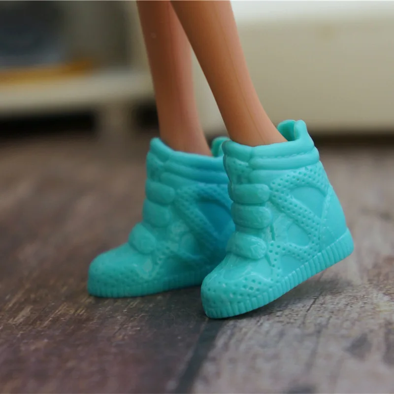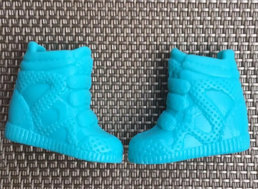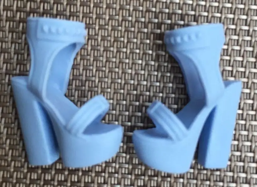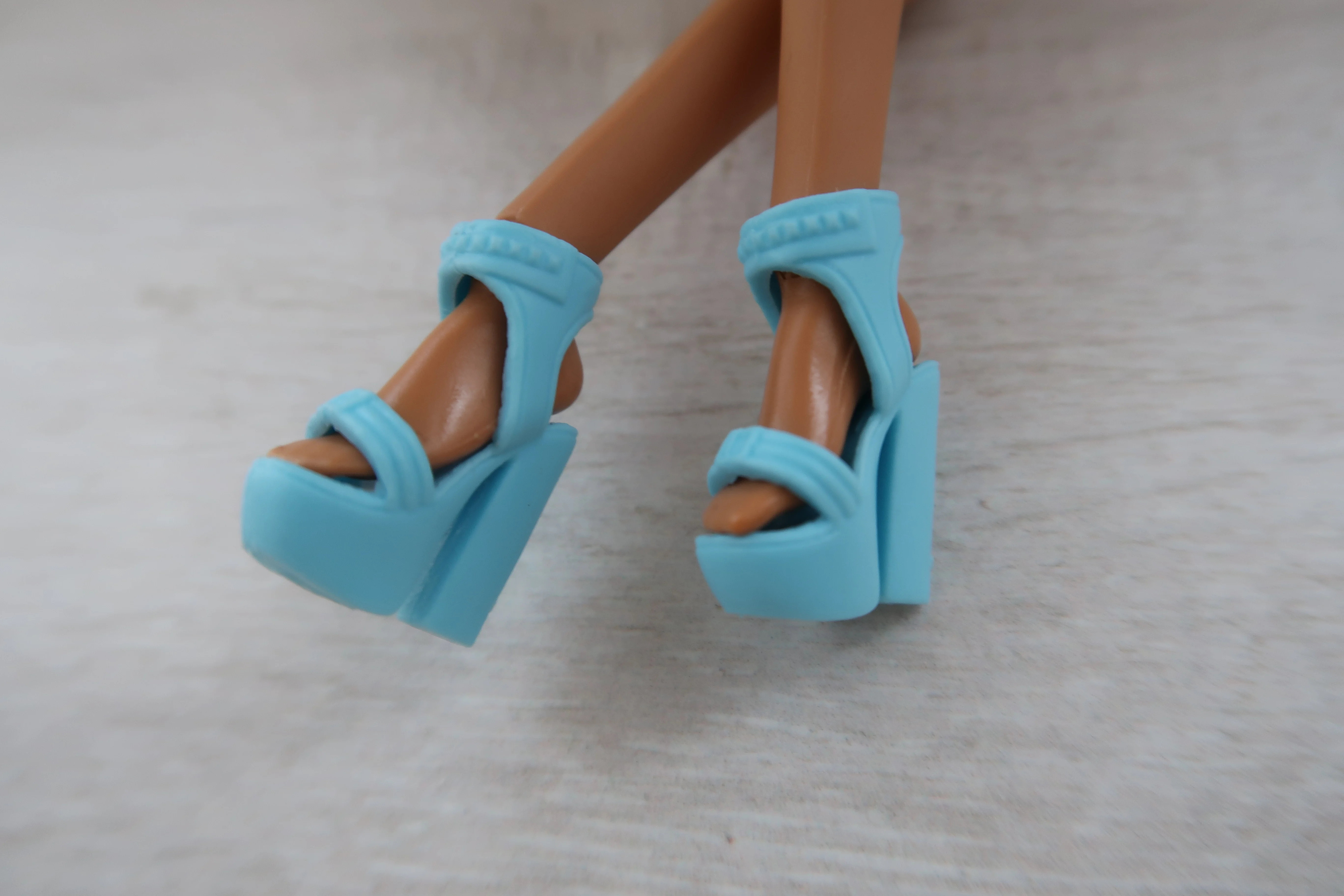 На фото прям нежно голубые, в реальности цвет немного другой, более насыщенно голубой. Очень мягкая резина, туфли на стандартном теле барби mtm буквально спадают с куклы. На пышках и высоких держатся гораздо лучше. Очень легко одеваются и снимаются. Куколка может в них стоять, но не устойчиво.