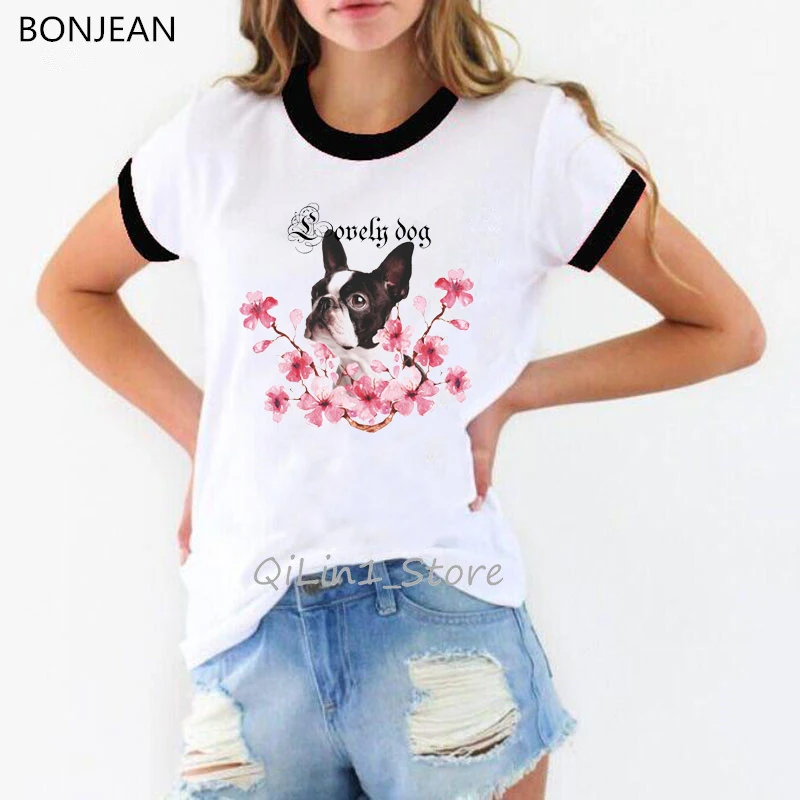 Футболка женская летняя с рисунком, винтажный топ с рисунком цветов, Бостон-терьера
