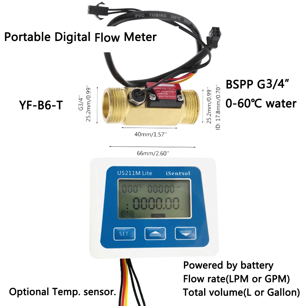 Белый фоновый светильник LCDТип подключения датчика потока: зависит от датчика потокаВходная мощность: 5 В постоянного тока или 3 AAA батареиТочность: +-1%Температурный диапазон: 0 -99 Цельсия