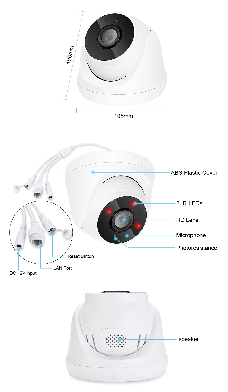 · Датчик изображения: 1/2.8 "прогрессивный датчик сканирования · Разрешение: 1920*1080 · Объектив: по умолчанию 3,6 мм · Автоматический баланс белого и 3D-DNR · Ночное видение: 3 ИК-светодиодов 100 футов (30 м) · Минимальная освещенность: цвет 0,1 люкс, B/W 0,01 люкс · Буит в микрофон