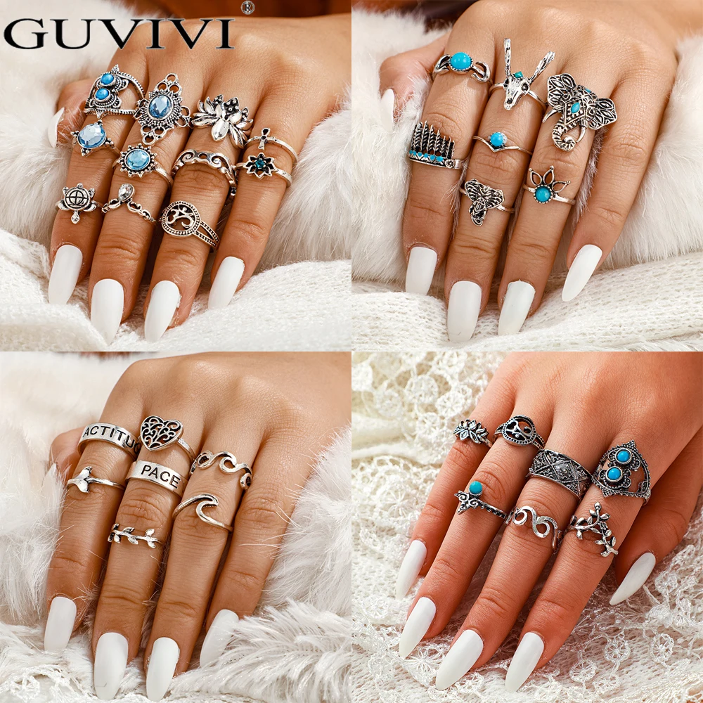Бохо Винтаж Серебряный цвет кольца набор Лотос Слон Шарм миди повязки на палец Опал Кристалл декор Этнические Племенные женские украшения подарок