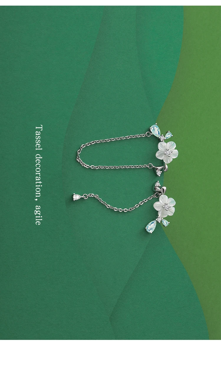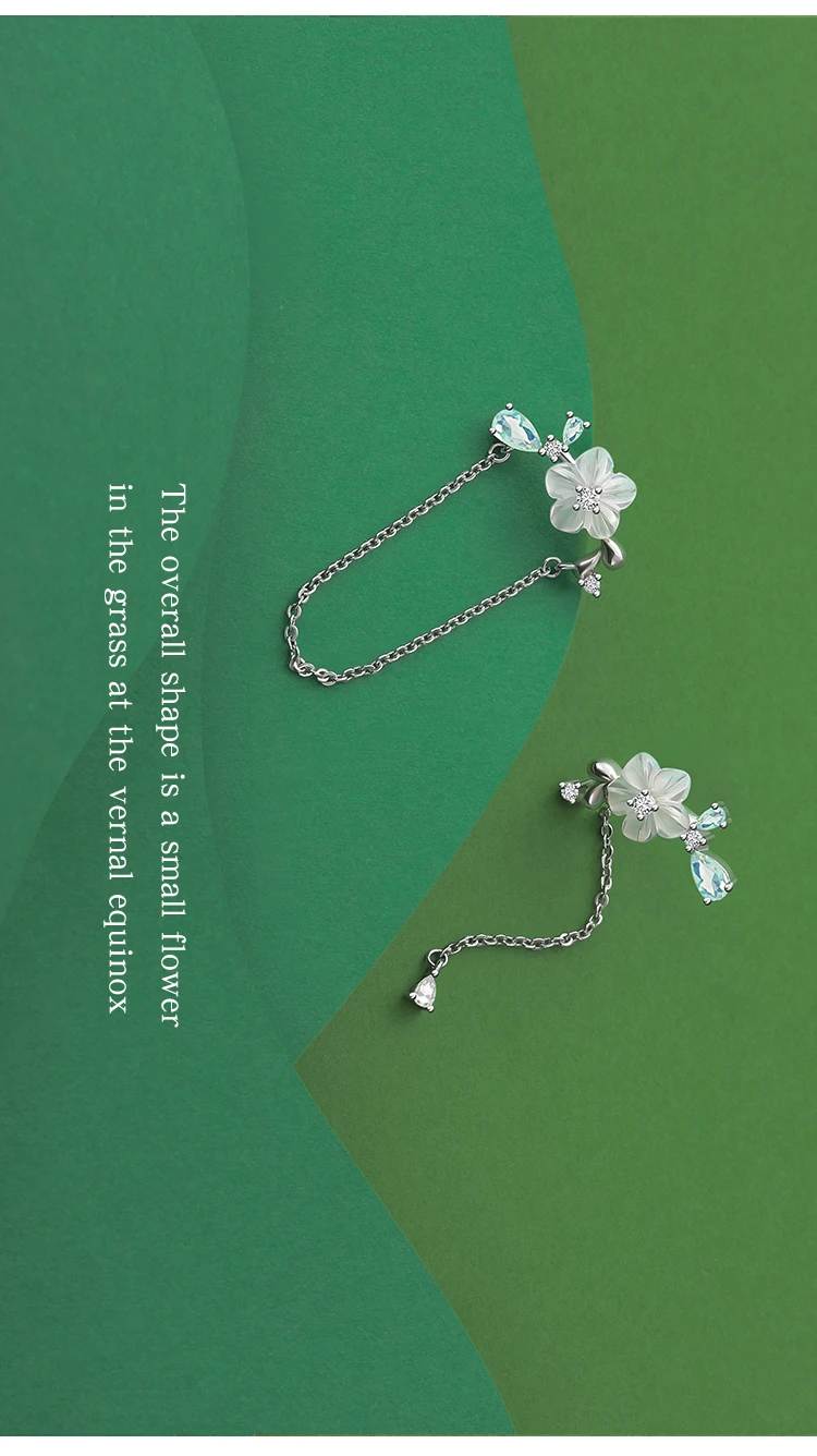 1) общая форма-маленький цветок в траве на верноле 2) белый корпус резной цветочный узор, белый цирконий выбран в качестве украшения цветка сердца 3) нежный зеленый СПАР, представляющий траву и листья, свежий цвет 4) Украшение кисточками