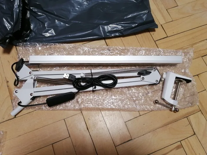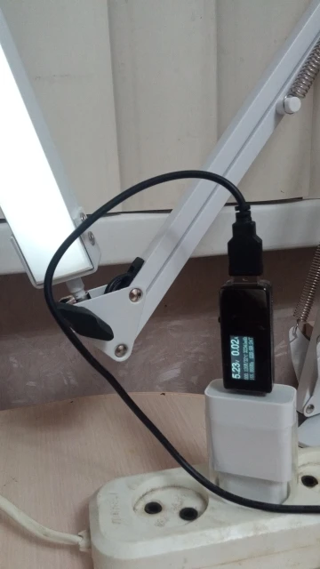 Неплохая лампа. Корпус металлический, ручки зажимов пластиковые (одна их них была частично надломана). Регулировка уровня освещенности и теплоты света. Питание от любого адаптера на 5 В или от USB 3.0 порта компьютера. Максимальное потребление 11,2 Вт (2,42 А). Хорошая цена с большим купоном продавца (за отметки в течение недели). Доставка за 52 дня.
