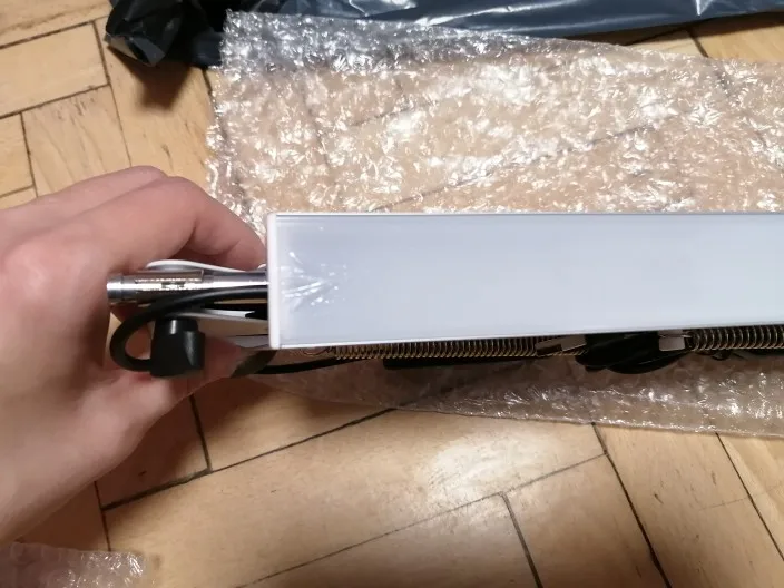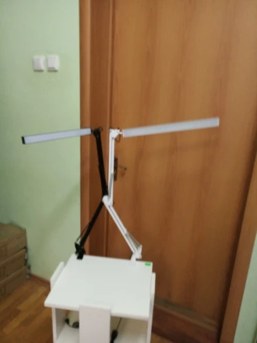 посылка пришла очень быстро. лампа обалденная, из минусов: 1) горит в выключенном состоянии (на фото видно); 2) болт на среднем узле плохо затягивается, не вовсе положения можно направить лампу начинает разгибаться под действием пружин; 3) не очень удобный пульт управления, на мой взгляд ясли был отдельный провод с пультом или что-то подобное, было бы намного удобнее ей пользоваться. Из плюсов: можно лампу направить светить ниже уровня крепления ( как на втором фото), но для этого нужно снять нижние пружины иначе не даст опустить; 2) очень длинные звенья, можно подсветить на метр дальше от крепления. товаром доволен рекомендую для покупки.