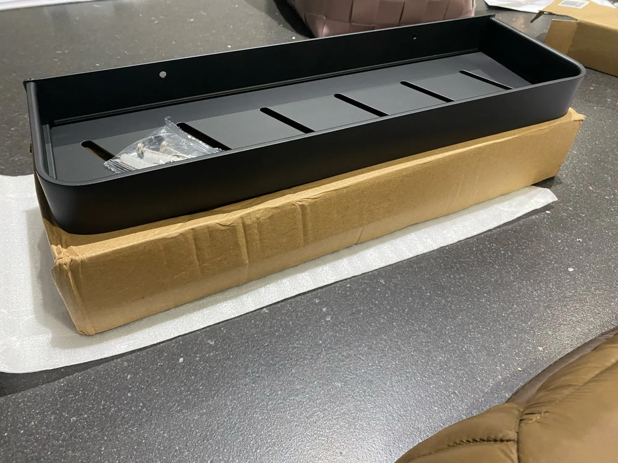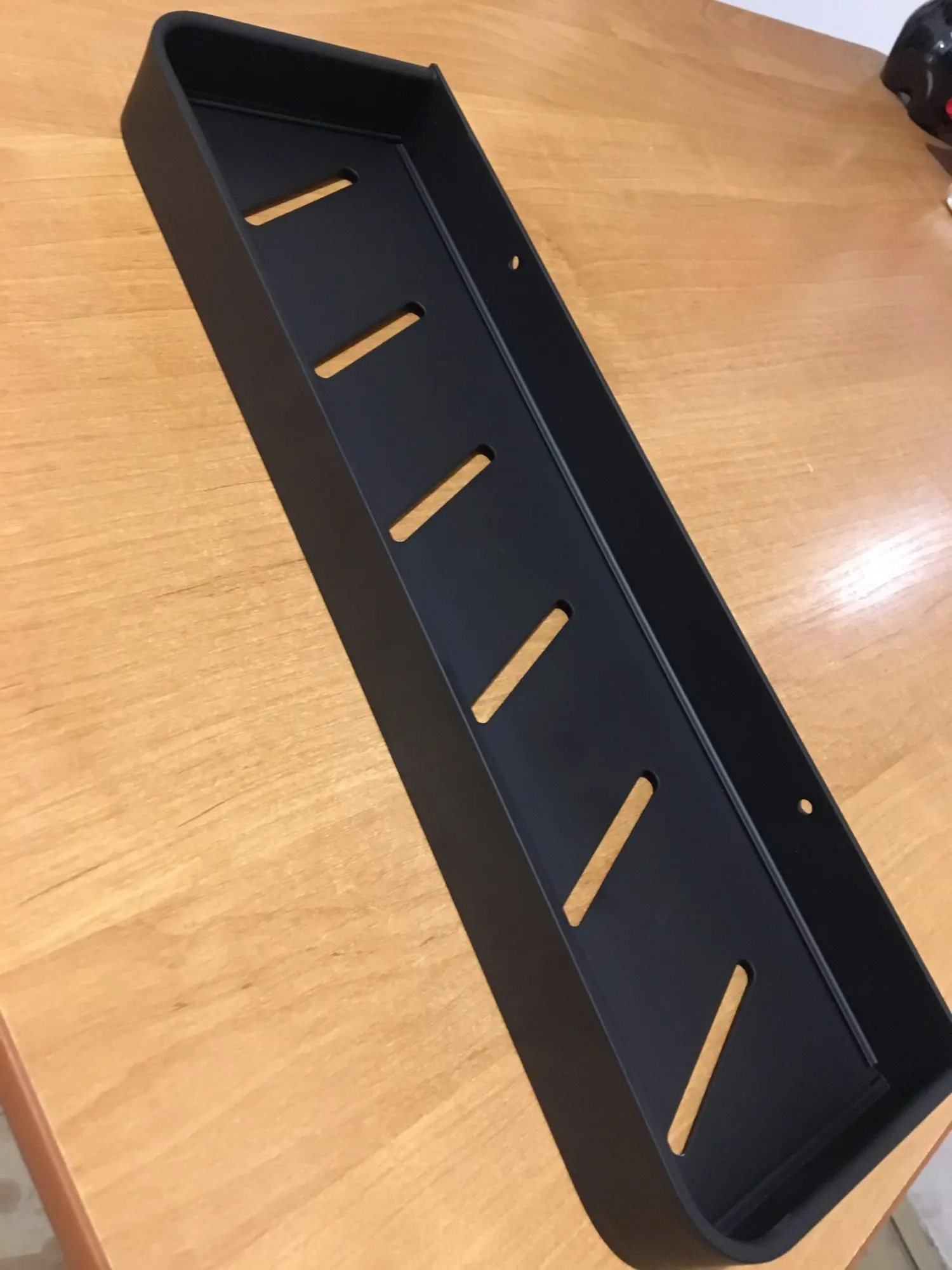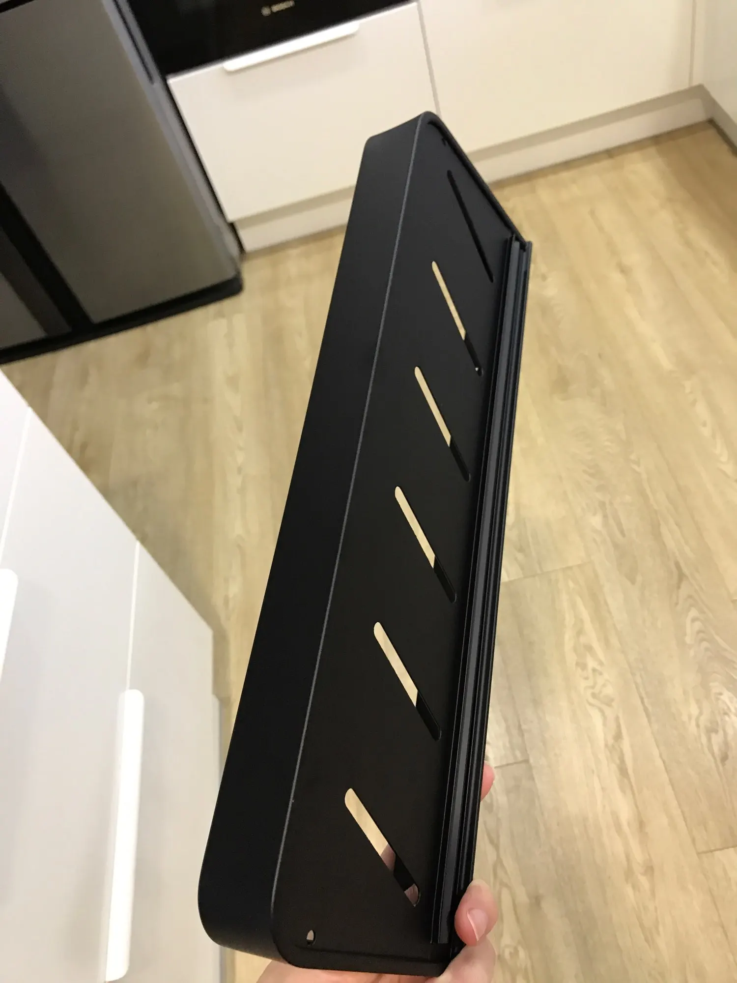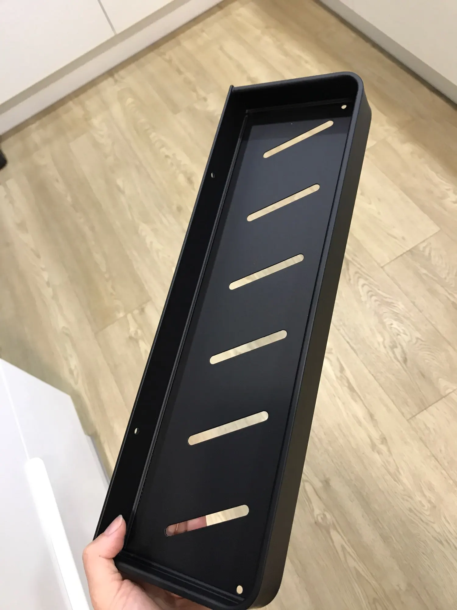 Заказ пришёл вовремя, упакован хорошо. Пока установили только одну полку, все отлично. Смотрится стильно, покрашено ровно.