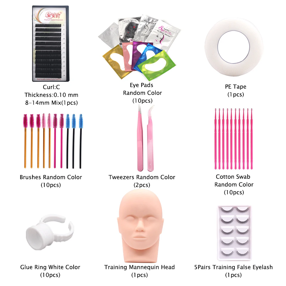 1 * наращивание ресниц (Смешанная длина)10 шт. подушечки для глаз (случайный цвет)1 * полиэтиленовая лента10 кистей (случайный цвет)2 пинцета (случайный цвет)10 шт. ватных тампонов (случайный цвет)10 шт. клеевые кольца белого цвета1 * тренировочная голова манекена1*5 пар тренировочных накладных ресниц1*7 пар наклеек1 * воздуходувка (случайный цвет)1 * косметичка