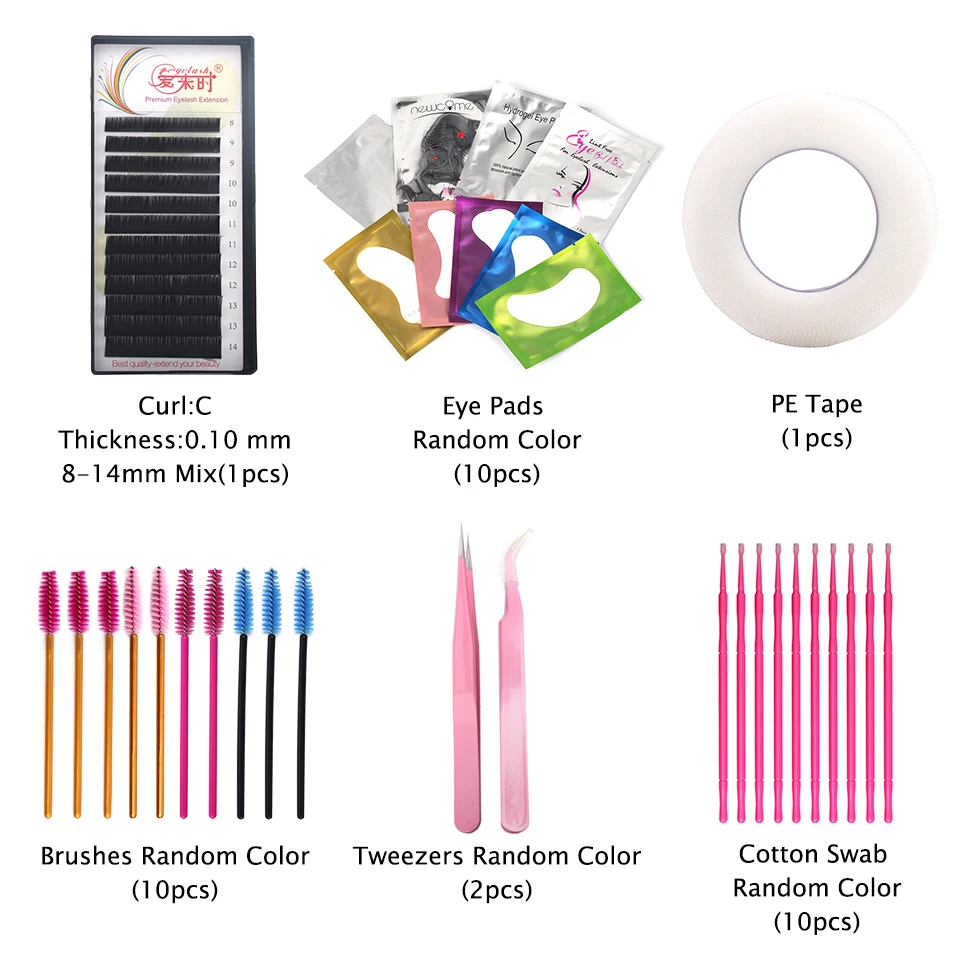 1 * наращивание ресниц (Смешанная длина)10 шт. подушечки для глаз (случайный цвет)1 * полиэтиленовая лента10 кистей (случайный цвет)2 пинцета (случайный цвет)10 шт. ватных тампонов (случайный цвет)