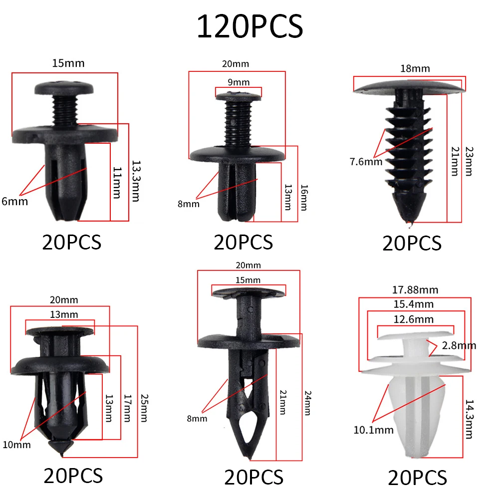 Изготовлен из высококачественного черного нейлонового материала, фитинг для отделки дверей, щиток радиатора, крыло, бампер и защита от брызг Замена фиксаторов для Ford, GM, Chrysler, Toyota, Nissan, Honda, jeep, BMW, Benz и многое другое. С помощью инструмента для удаления застежки в комплекте Вы можете свободно заменить старые и сломанные дверные панели автомобиля и зажимы для обивки, не нанося ущерб вашему автомобилю.