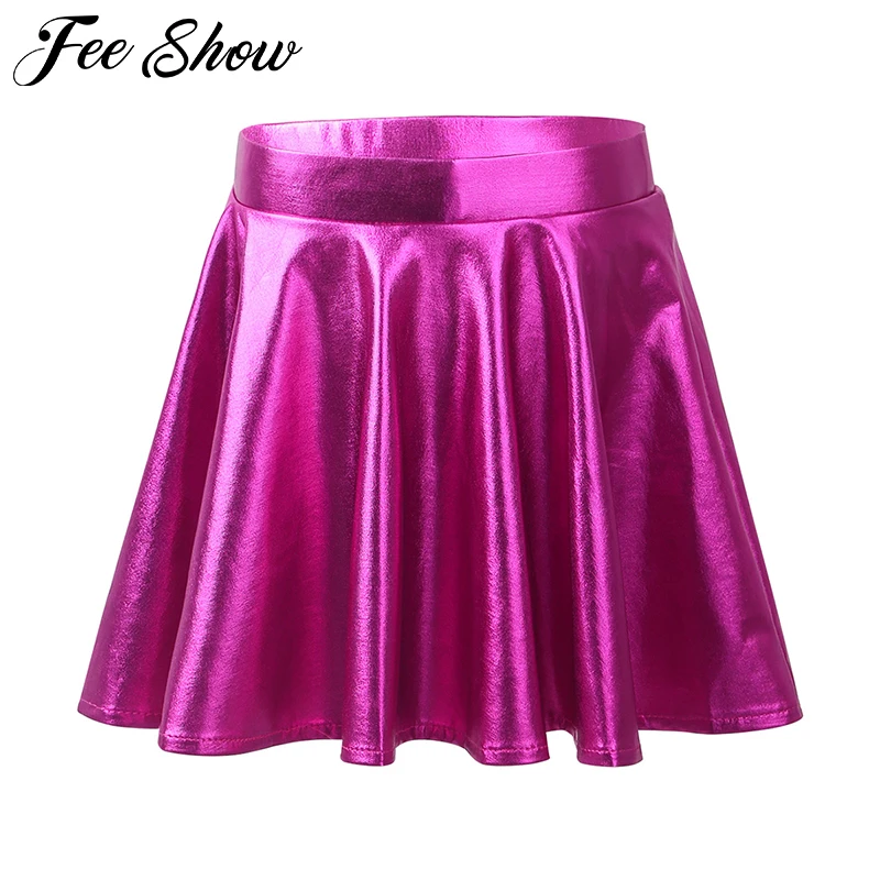 Детская юбка для девочек, блестящая металлическая расклешенная плиссированная мини-юбка трапециевидной формы, юбка для танцев, Спортивная блестящая юбка скутер с высокой талией