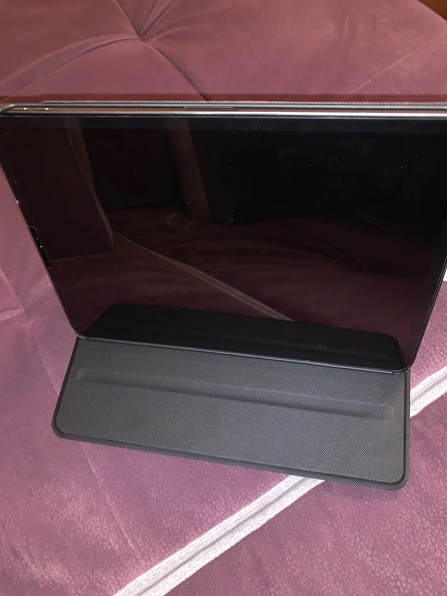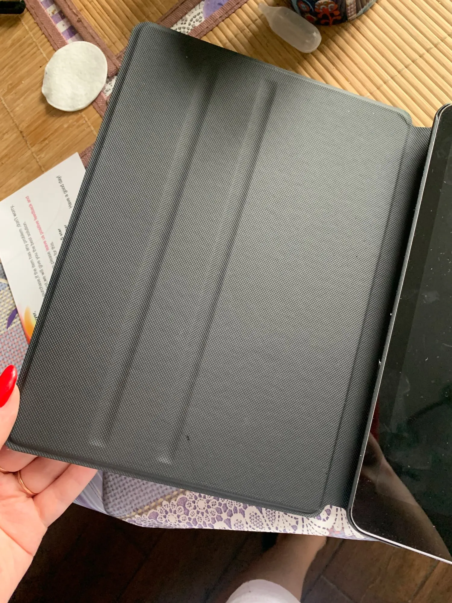 Чехол приятный на ощупь. Есть надлом около камеры - это дефект, но это несильно заметно. Я БЫ НЕ РЕКОМЕНДОВАЛ ЭТОТ ЧЕХОЛ. Я хотел другой, но по картинкам пришёл точный экземпляр. Он хороший, но он НЕ НА МАГНИТАХ. Крышка, которая прикрывает экран, НЕ магнитится. И фиксация планшета не самая удобная. Лучше выбрать чехол слегка подороже с магнитами и чтобы крышка скручивалась и магнитилась к экрану