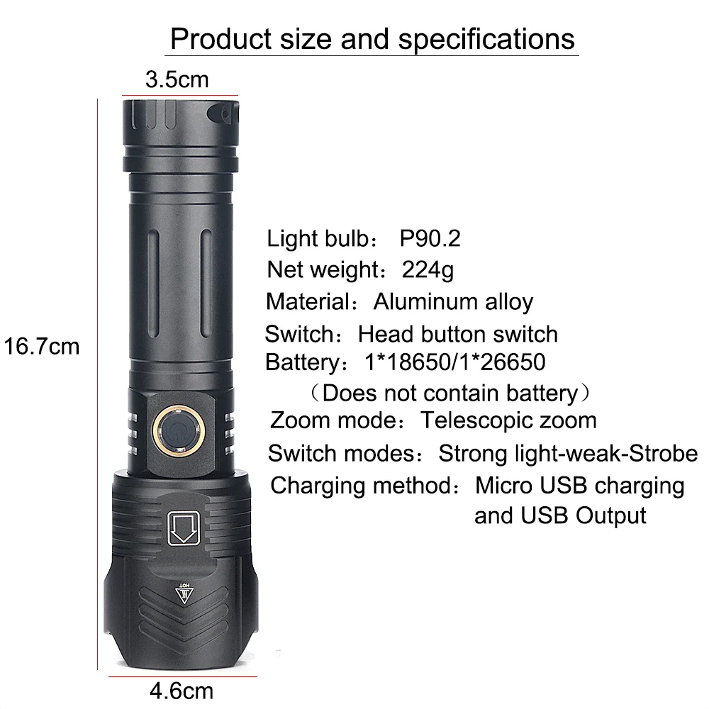Источник светильник: XHP90.2 Цвет внешнего вида: черный Размер: 17,0 см × 4,8 см × 3,3 см Питание: 1 аккумулятор 26650 или 1 аккумулятор 18650 Способ зарядки: Прямая зарядка через USB Радиус действия: от 200 до 500 метров Степень водонепроницаемости: IPX-6 Вес нетто: 200 г (без батареи) Материал корпуса: алюминиевый сплав Масштабируемый: Регулируемый фокус Материал: алюминиевый сплав 3 режима переключения: Сильный-слабый-стробоскоп