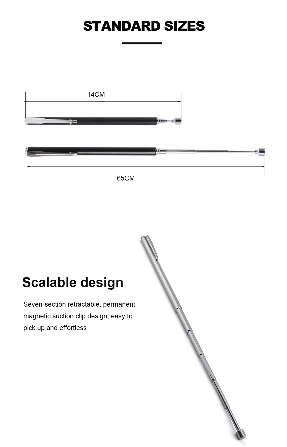 Описание продукта: Материал: металл + Магнитный Цвет: серебристый/черный (опционально) Длина: около 140 ~ 650 мм/5,512 ~ 25,59 дюймов (регулируемая) Уведомления 1. Карманный зажим для ручки, легко носить с собой и использовать. Выдвижная конструкция, головка может впитываться в узкое пространство. 2. Подходит для всех видов автомобильных заводов, высокого загрязнения, текстильной мастерской, узкого пространства, может забрать гайки, болты, винты и другие металлические детали. 3. Калибровки монитора отличается друг от друга. Цвет товаров, показанных на фотографии, может немного отличаться от реального товара. Пожалуйста, выберите оригинал в качестве стандарта 4. Из-за ручного измерения допускается погрешность в 1-5 мм. Спасибо за понимание. 5. Пожалуйста, не связывайтесь с водой. Легко ржавеет во влажной и коррозионной среде; 6. Веб-сайт для отслеживания и запроса транспорта doc No.: https://www.17track.net.