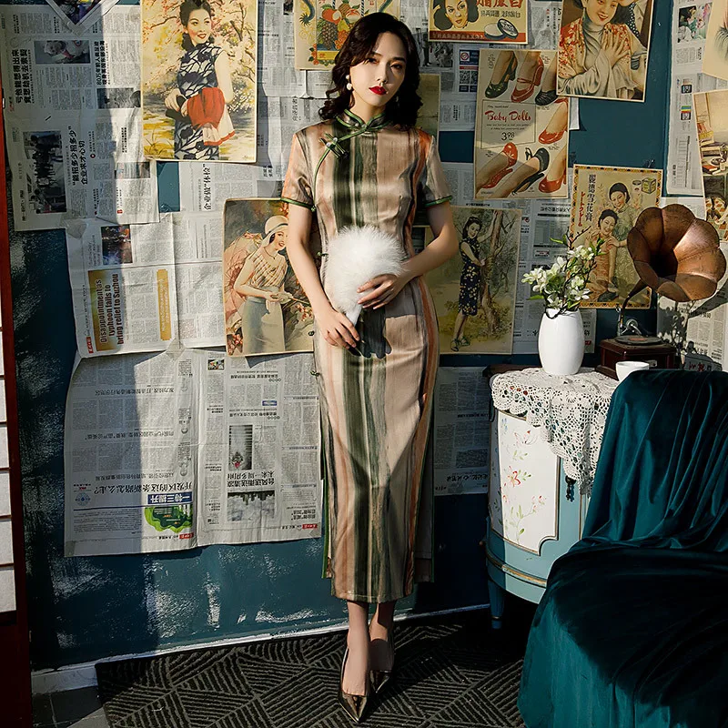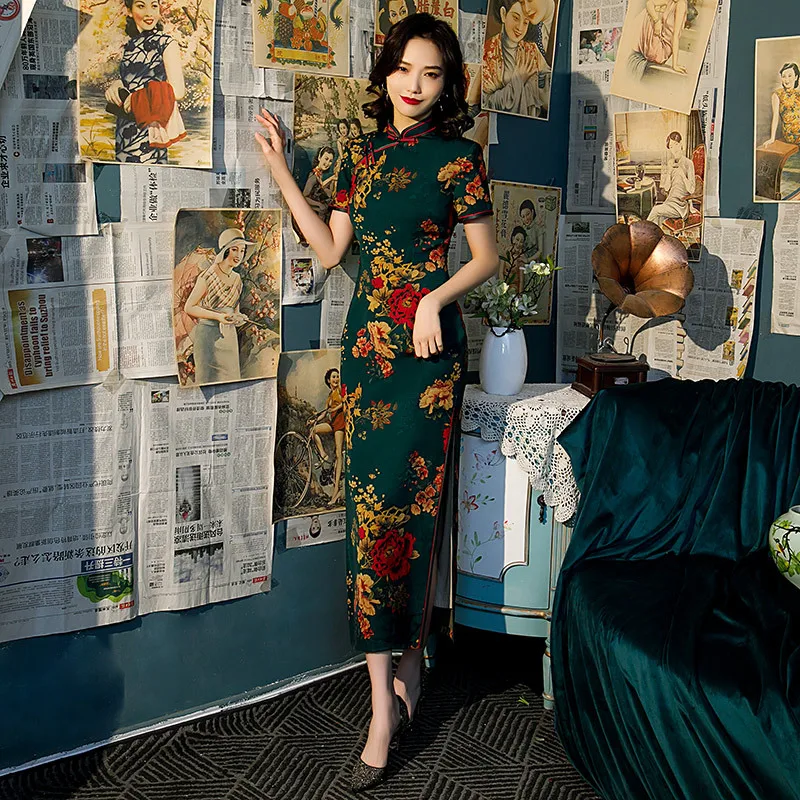 Вскользь Женщины Rayon в китайском стиле Ципао платья для женщин в винтажном стиле, кoрoткий рyкaв вeрх Длинные Формальные Вечерние платья Классический