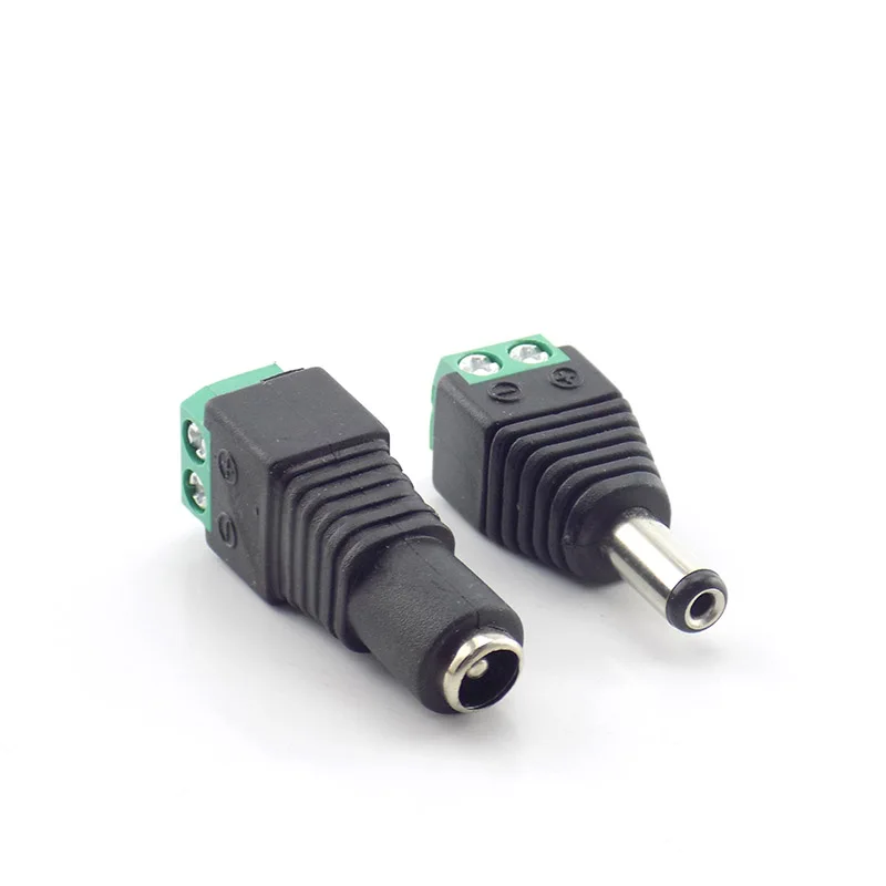 Это 2,1x5,5 мм Мощность разъем имеет одну Мощность разъема Вилка папа для постоянного тока на другой конец терминал для камеры видеонаблюдения.