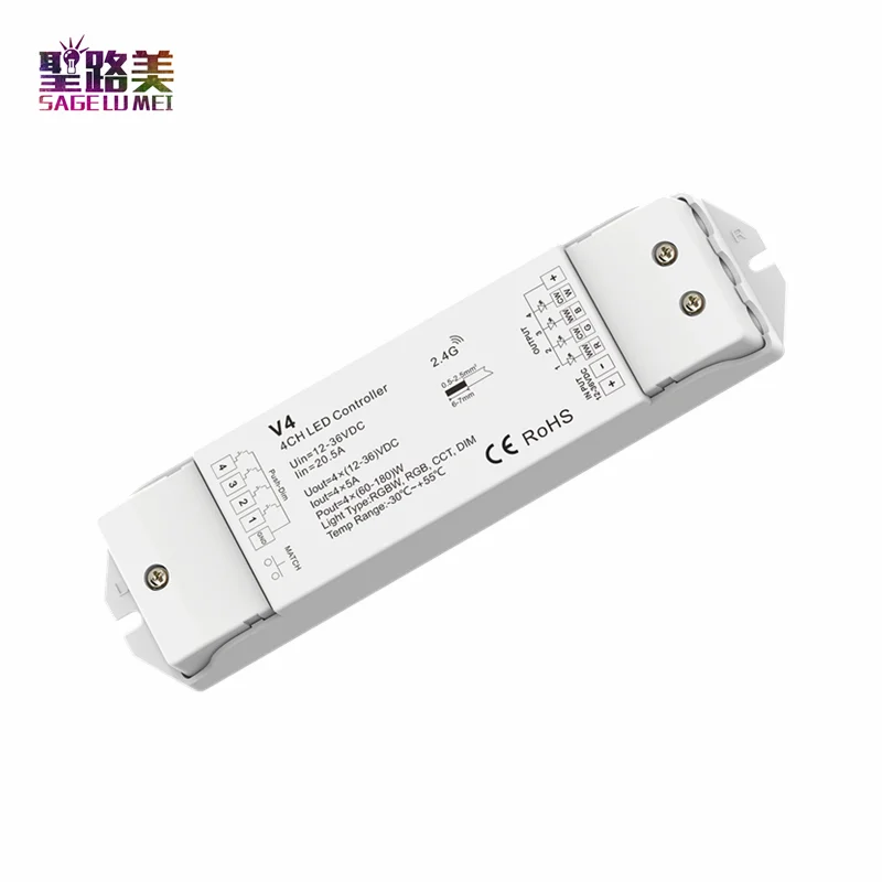 4-канальный светодиодный радиочастотный контроллер V4 12-36 В постоянного тока, 24 В, RGBWRGBCCTзатемнение, 4 канала, 5 Аканал, затемнениеМножественная защита CV