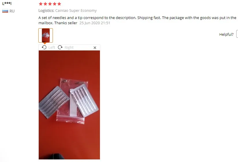 доставка в Волгоградскую область 18дней. Иголки пришли в обычном пакете в пупырку. Одноразовые иголки упакованы в индивидуальную упаковку по 5 штук, многоразовые - приложены в общий пакетик. Проверить качество иголок не могу, так как сам аппарат ещё в пути (заказывала у другого продавца). С продавцом не общалась, но за товар ему спасибо.