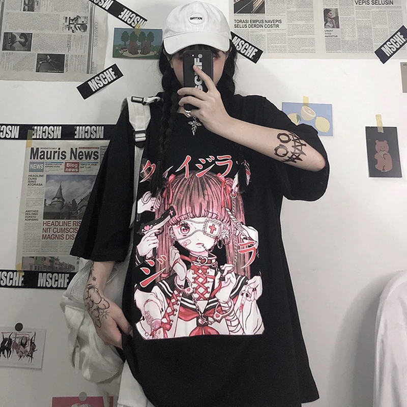 Футболка женская в готическом стиле, Свободный Топ с аниме принтом,...