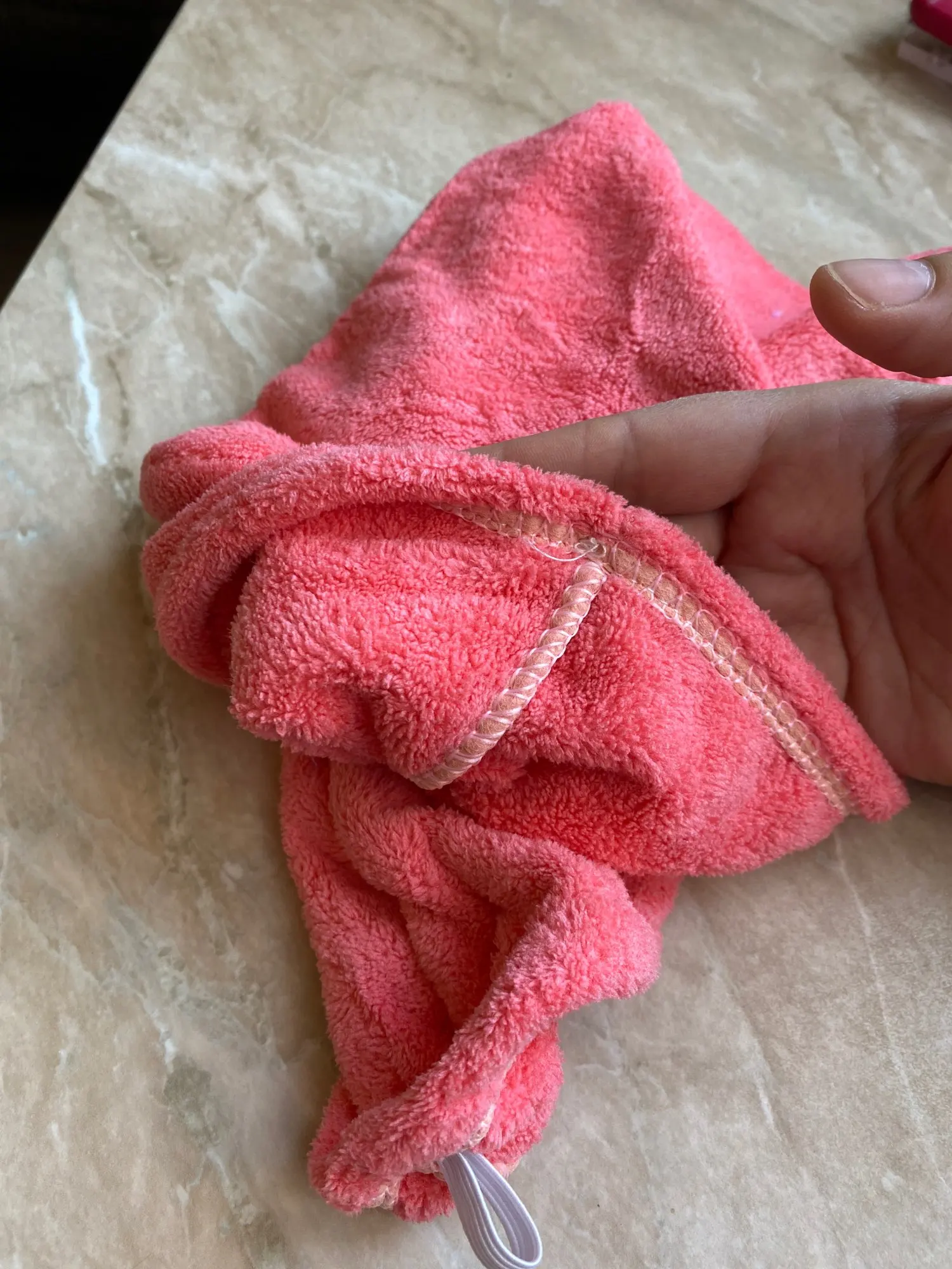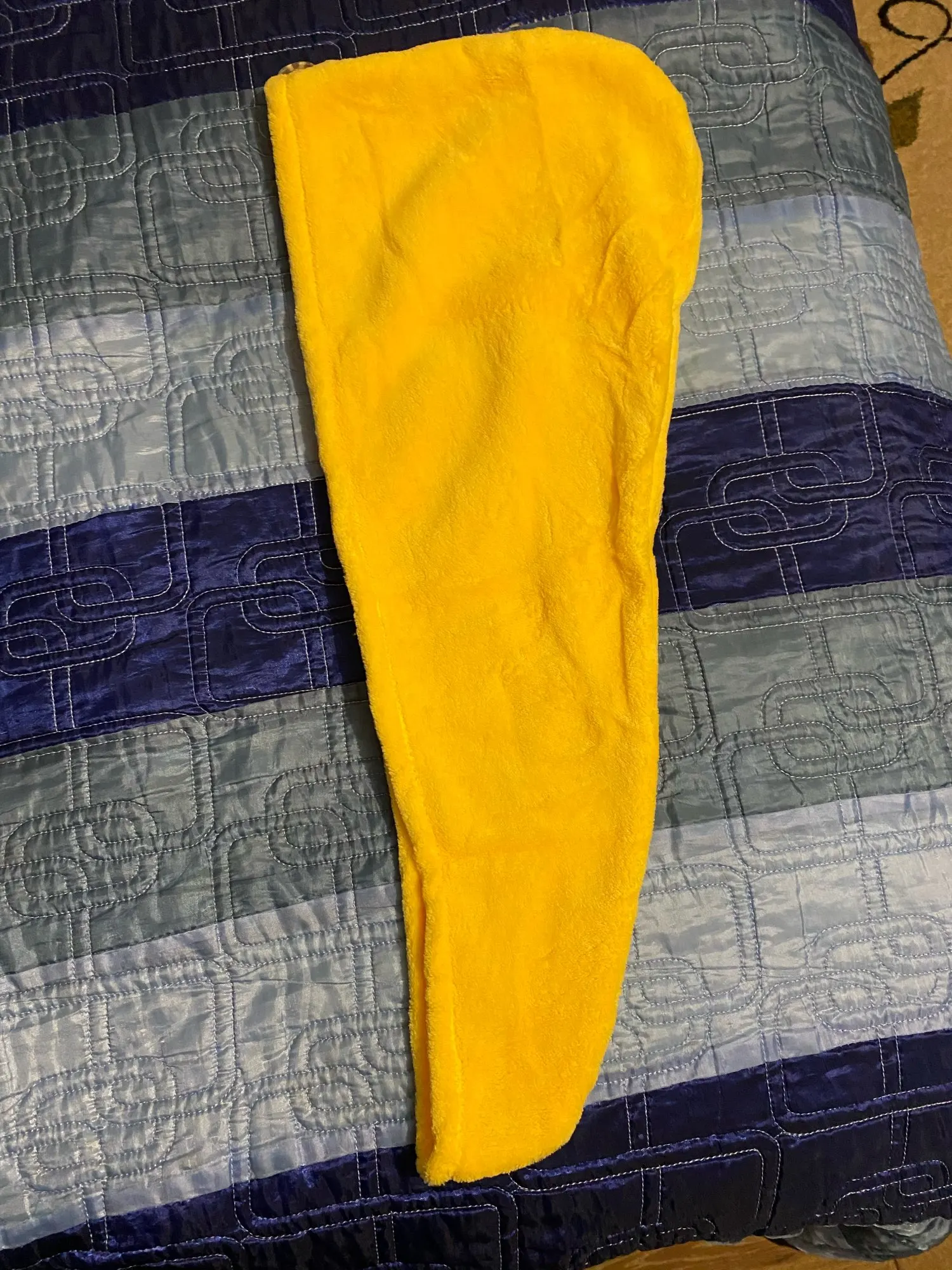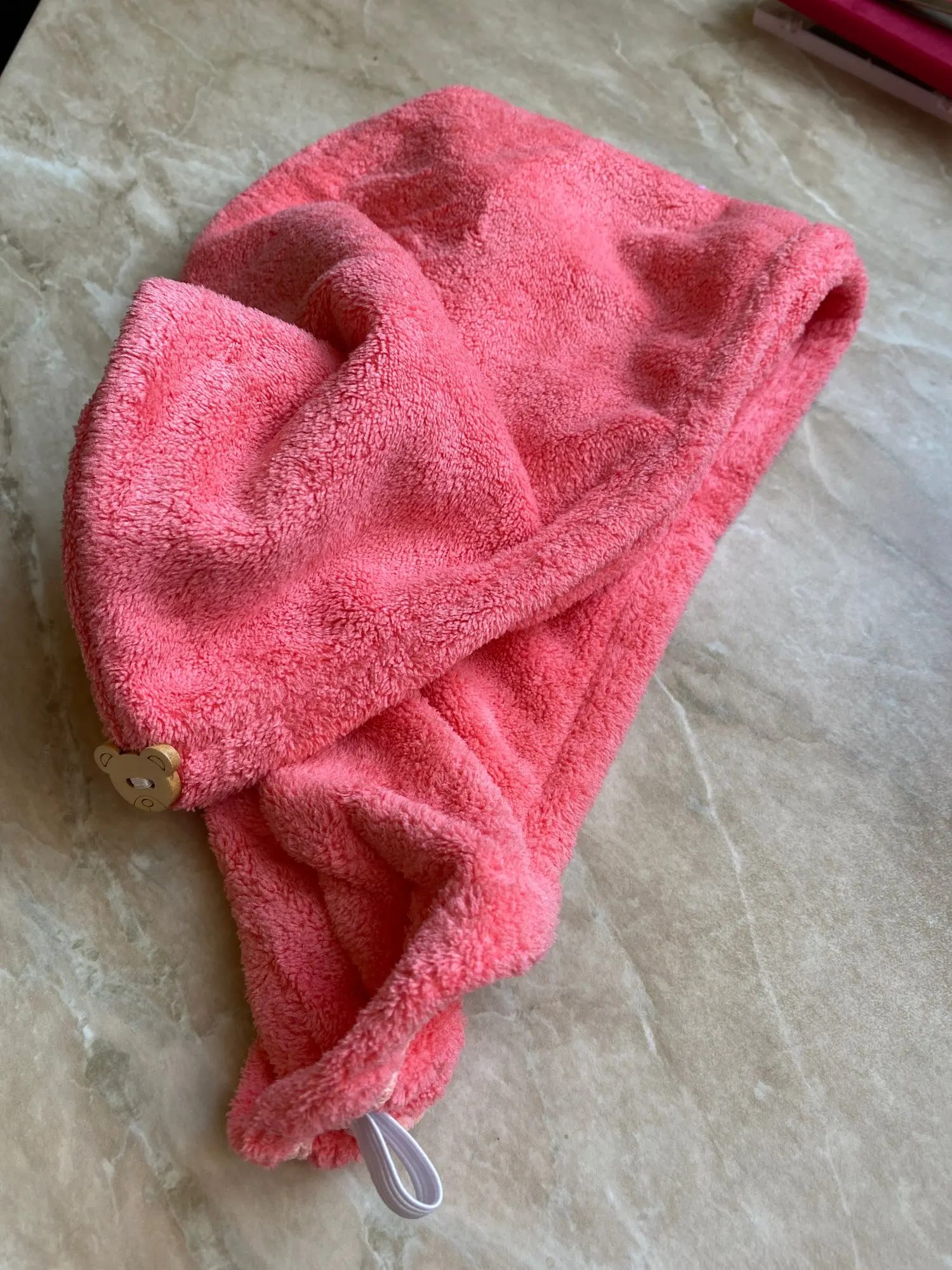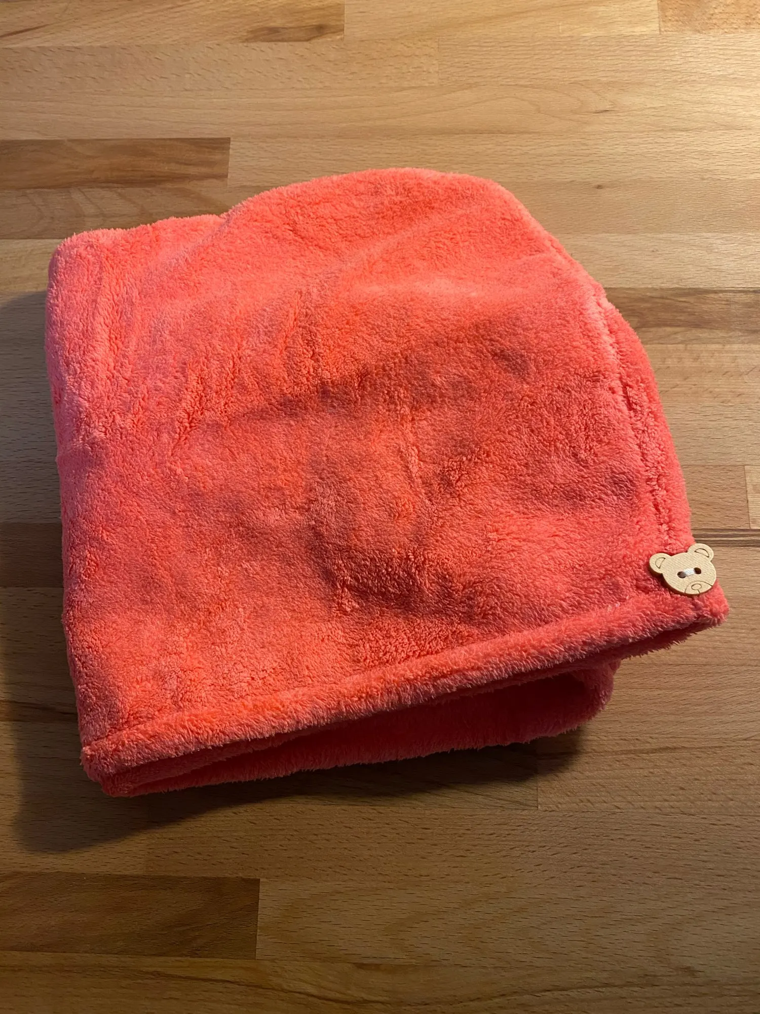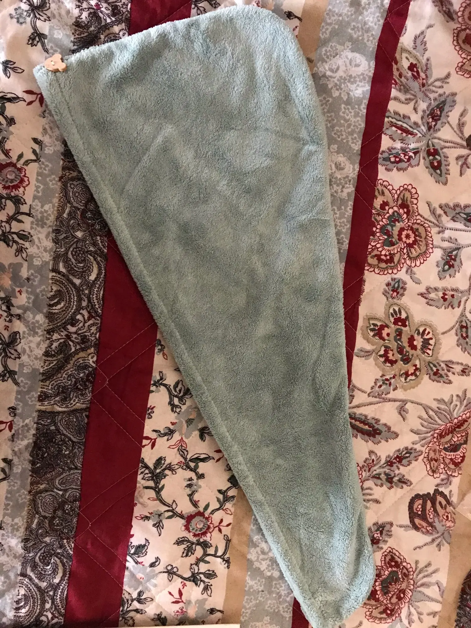 Полотенце пришло без пуговицы, но это не большая проблема. По размеру маловато на длинные волосы, хотелось бы чуточку побольше. Но за такую стоимость нормально.