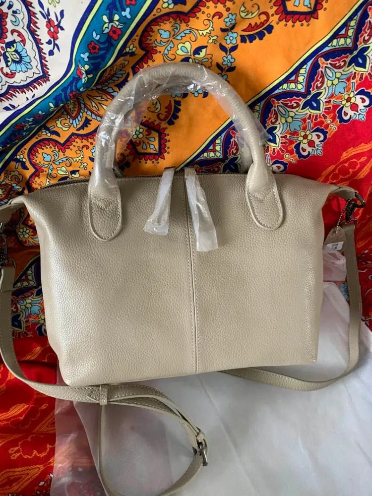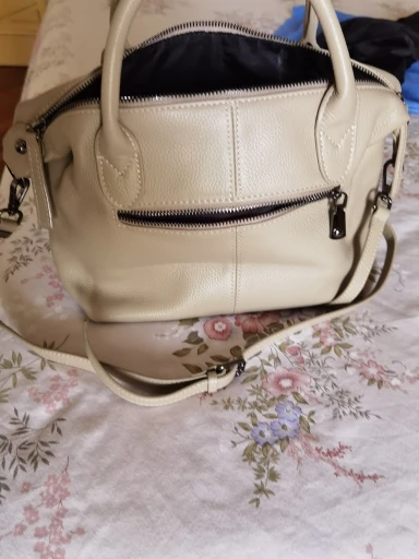 сумка не кожаная, цвет более темный - я хотела светлую, а получила серо-бежевую довольно темную сумку, размер тоже меня удивил - она меньше заявленных размеров