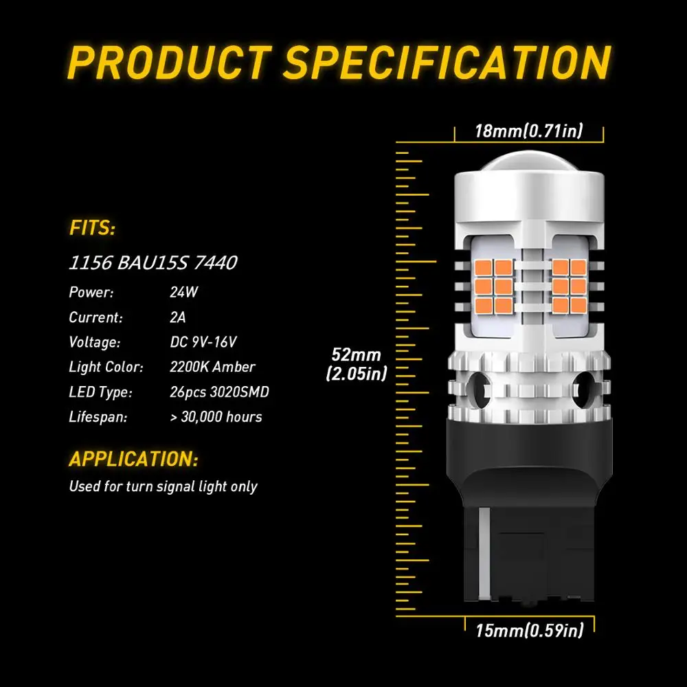 Применение: используется в качестве сигнала поворота Напряжение: DC12V-24V, используется только в автомобилях 12 В Ток: 2А Мощность: 24 Вт Бусины лампы: 26 шт. 3020smd Цвет: желтый светильник Люмен: 1350 лм Характеристики: без гипервспышки/Canbus без ошибок
