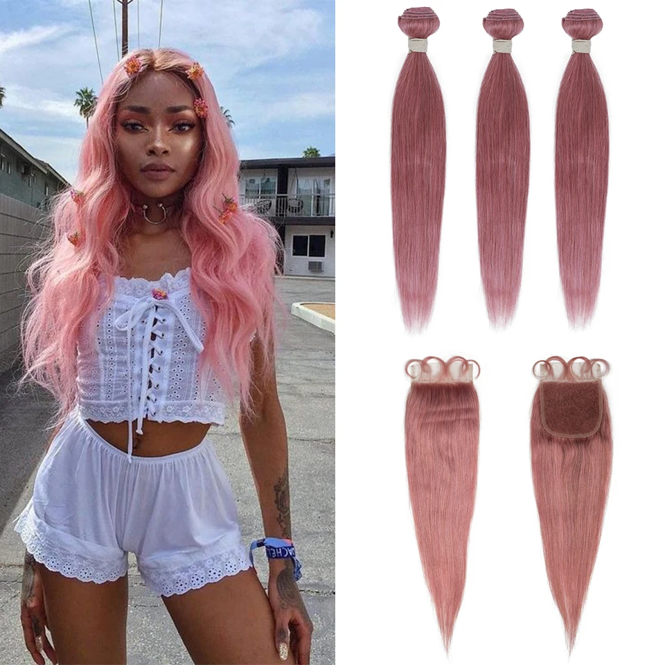 Remy Форте пряди с закрытием прямое розовое блондинка оранжевый человеческие волосы пряди с закрытием 3 бразильские волосы, волнистые пряди быстро