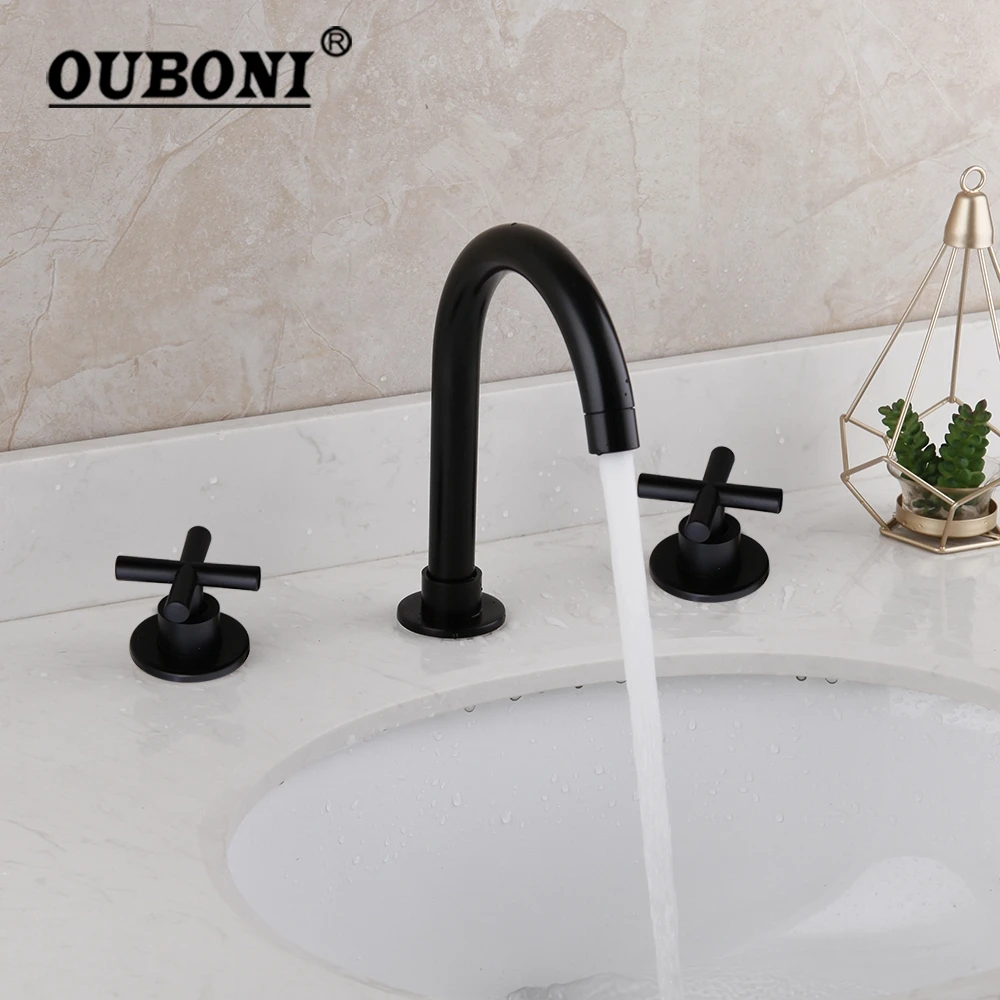 Матовый черный смеситель OUBONI для ванны, поворотный кран из твердой латуни для раковины в ванной комнате, 3 шт., 2 ручки