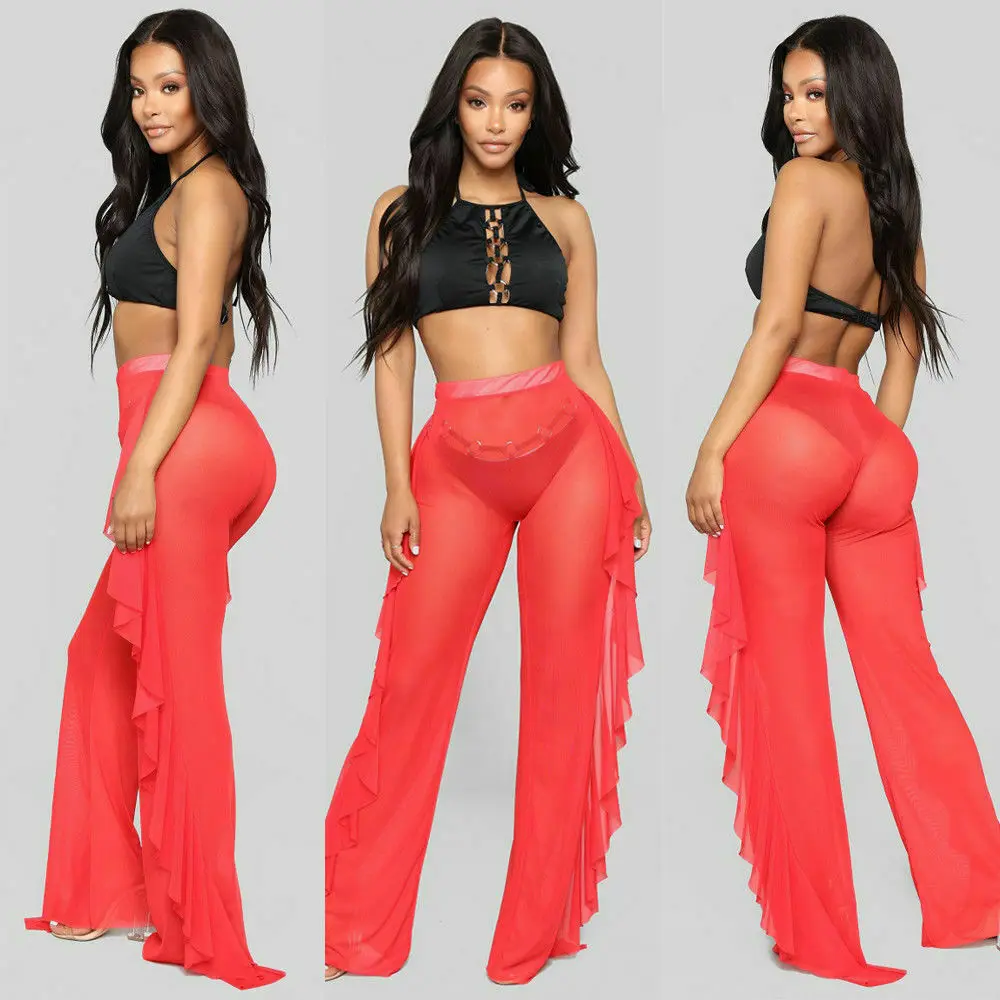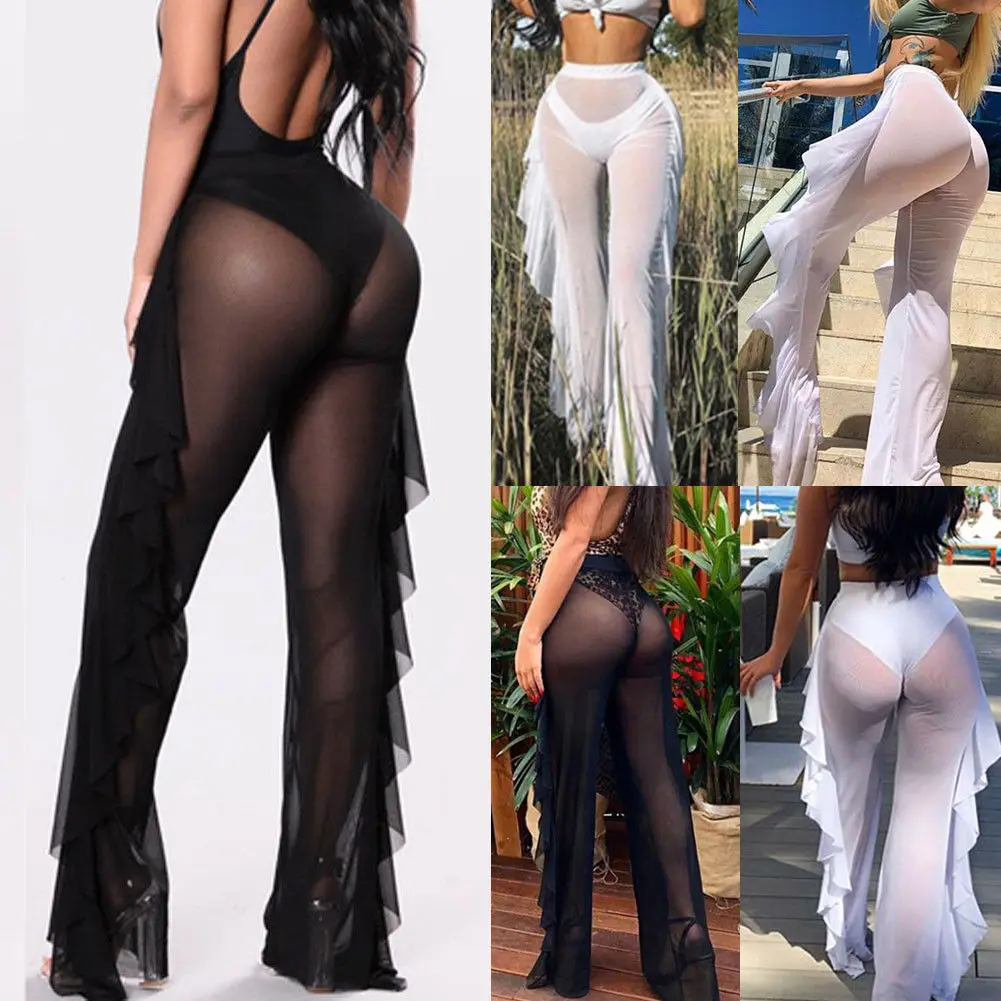 2020 женские прозрачные пляжные брюки-накидка, шифоновые прозрачные сетчатые летние купальники с оборками, свободные пикантные длинные брюки