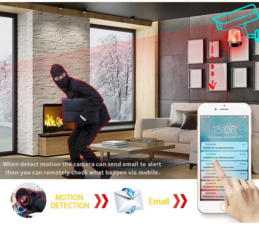Можно настроить область, которую вы хотите контролировать, когда она срабатывает, она отправит сообщение на вашу электронную почту, вы можете получить информацию из первых рук, независимо от того, когда и где вы находитесь.