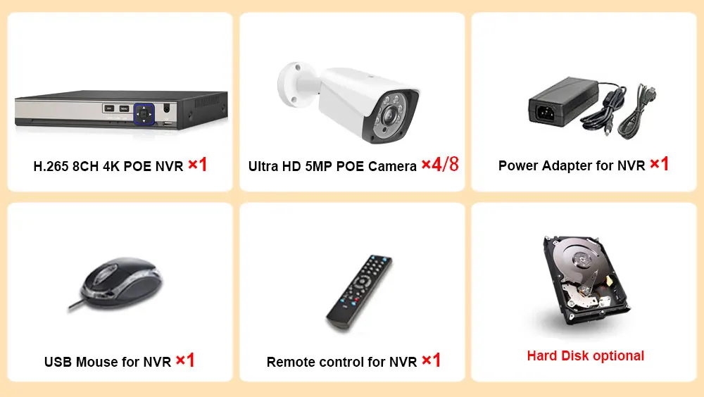 1 сетевой видеорегистратор 8CH 4K POE NVR;4/8 X HD POE IP 5.0MP Крытый Открытый ИК День ночного видения атмосферостойкие камеры;1 X Блок питания для NVR;1 х USB мышь для NVR;1 компакт-диск программного обеспечения для NVR;1 пульт дистанционного управления для NVR;Жесткий диск опционально!