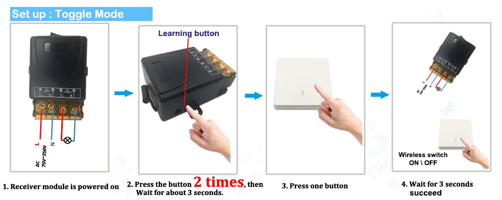 1. Дважды нажмите кнопку обучения (на приемнике). Подождите 3 секунды;2. Нажмите одну кнопку на настенный выключатель. Подождите 3 секунды. Преуспевает.