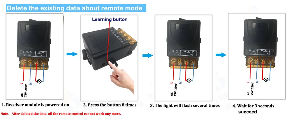 8 раз нажмите кнопку обучения (на приемнике). Существующие данные будут удалены успешно.