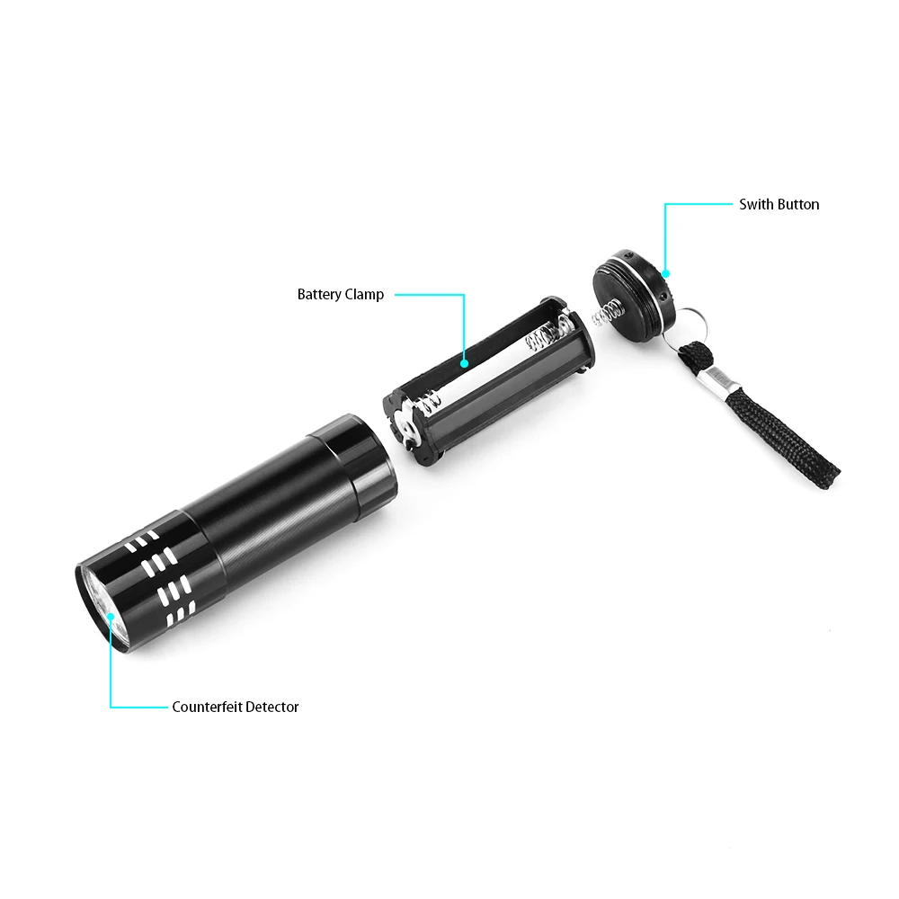 Изготовлен из алюминиевого сплава, прочный. Вы можете использовать 50000 часов длительный срок службы. 9 УФ-светодиодный индикатор позволяет покрыть большую площадь. Используется стандартная батарея 3 AA (не входит в комплект). Поставляется с веревкой, которая может крепиться на заднюю крышку, удобно носить с собой. Широко используется для медицинских устройств, стерилизации, отверждения чернил, обнаружения металлических трещин, устройства детектора денег, медицинских измерений и биометрических испытаний безопасности. Характеристики: Тип: Ультрафиолетовый светодиодный светильник Материал: алюминиевый сплав Количество: 1 шт. Цвет: черный Количество светодиодов: 9 шт. Светильник; Цвет: фиолетовый Срок службы: 50000 ч Переключатель: ВКЛ./ВЫКЛ. Питание: 3 * AAA батареи (не входят в комплект) Размер изделия: 2,4*8,4 см/0,9*3,3 "(Д * В) Чистая Вес: 22 г/0,8 унции Посылка: 1 * Ультрафиолетовый светодиодный светильник 1 * коробка для посылка Упаковочный лист1 * Ультрафиолетовый светодиодный светильник 1 * коробка для посылка