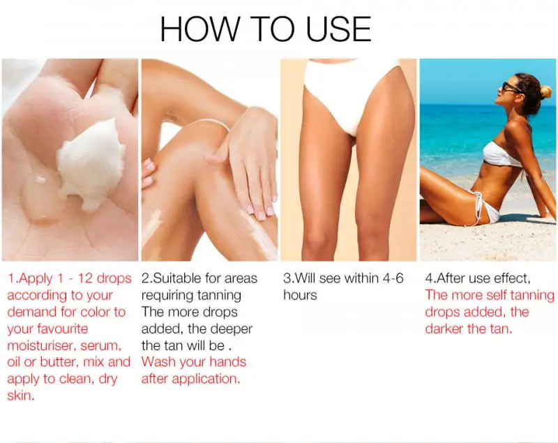 1. Добавьте 2-12 капель загара в ваш любимый лосьон для тела или увлажняющий крем, Смешайте вместе и равномерно нанесите на кожу. (Чем больше загар вы потеете, тем темнее он будет)