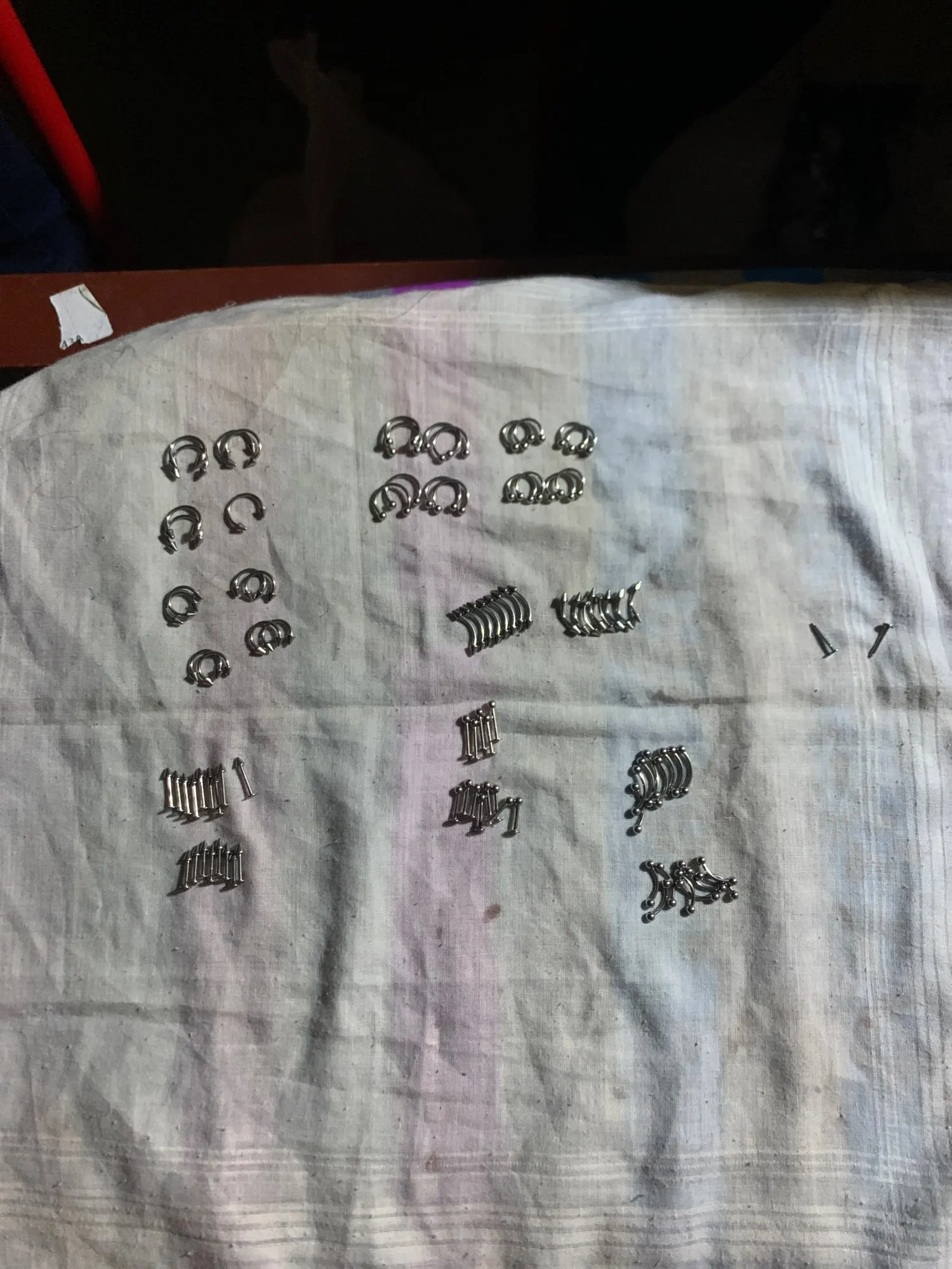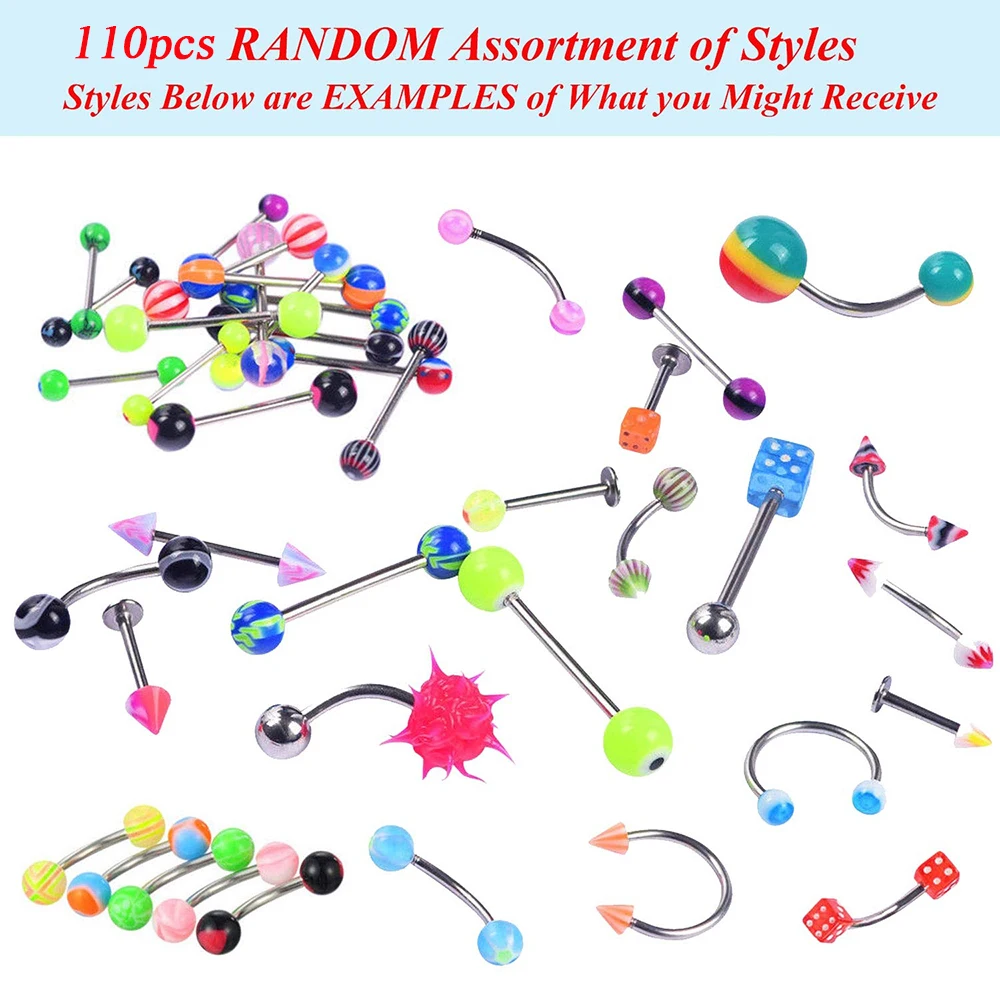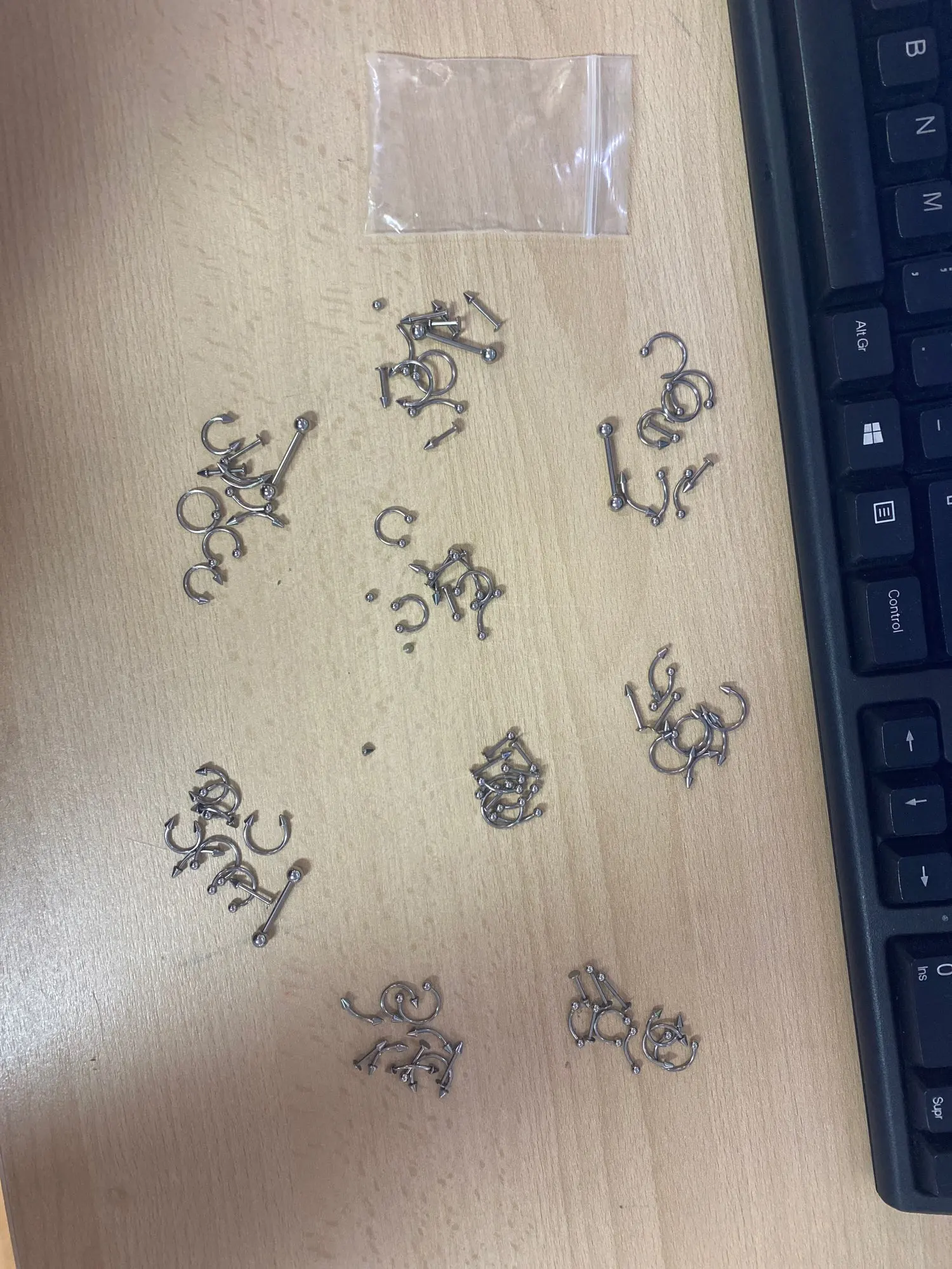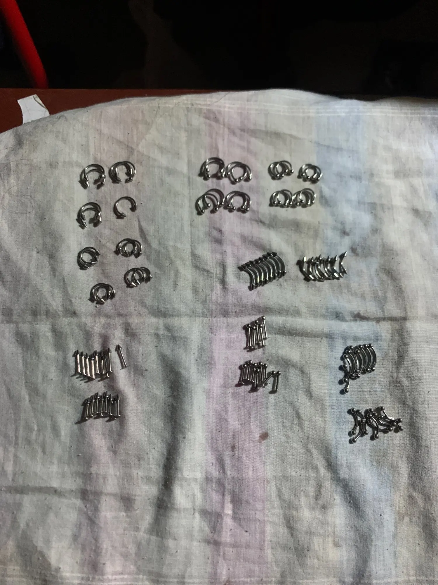 Un joli lot de percing, plein de modèles que ce soit pour la langue, oreille, nez, arcade, nombril. Mais aucun pour les tétons. Les attaches sont à vis en plastique et le métal à l'air d'être en acier chirurgical.