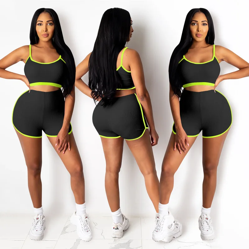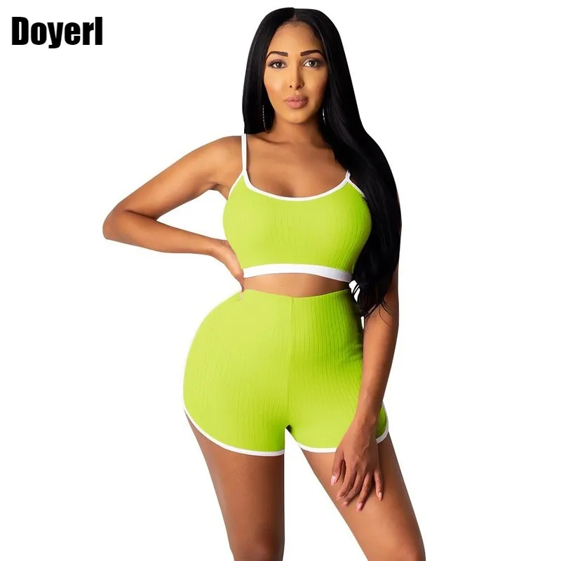 Неоновый Повседневный Спортивный комплект из двух предметов, женский спортивный костюм, короткий топ и облегающие велосипедные шорты, летний комплект из двух предметов, наряды для женщин, оптовая продажа