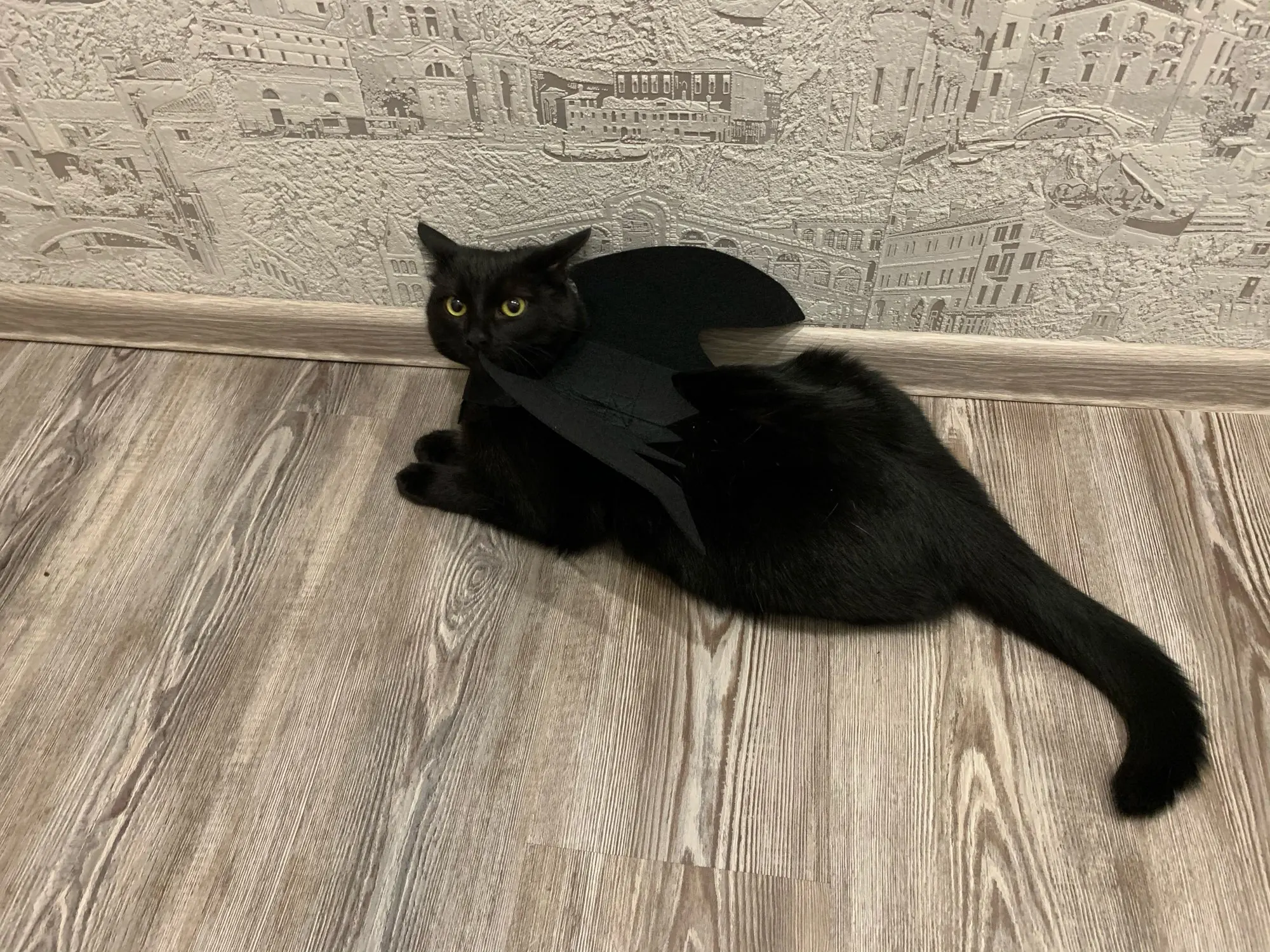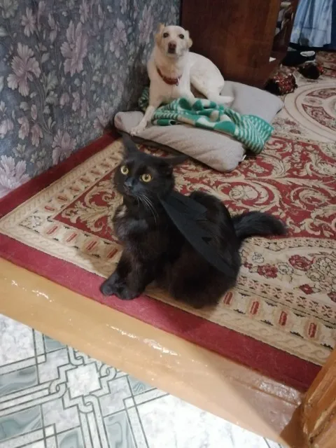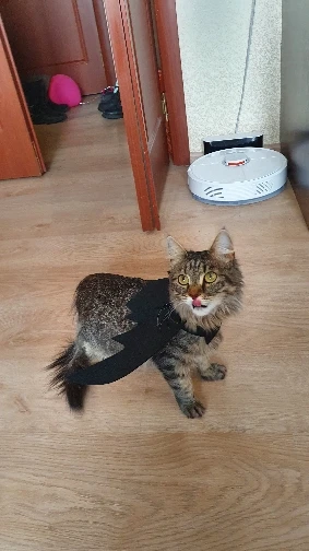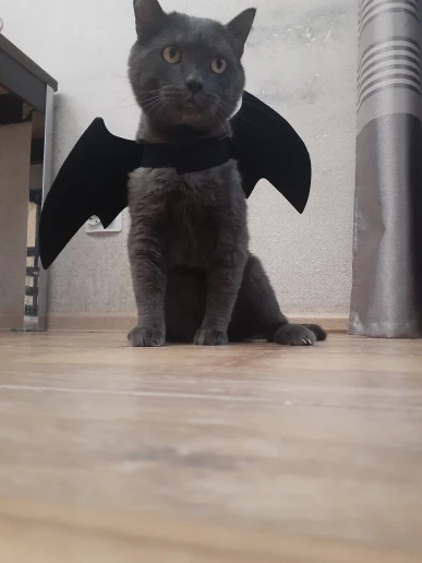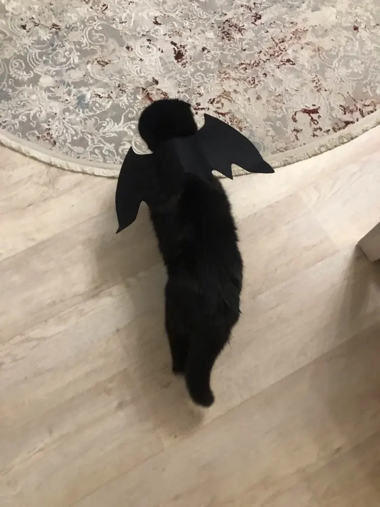 Прикольная штука. Коту не нравится, но нам очень нравится. По дому скачет маленький демон. Крепления вполне надёжные, пара лямок с липучкой на шее и пара на животе. До Новосибирска шло месяца полтора, жаль что не успела к хэллоуину.
