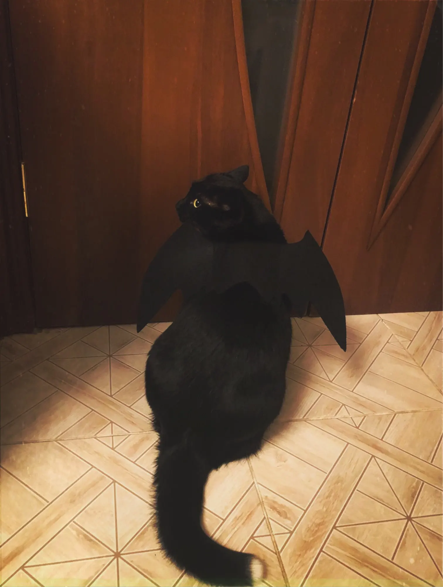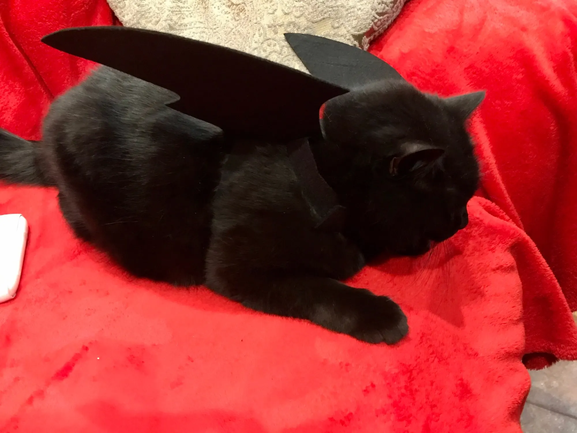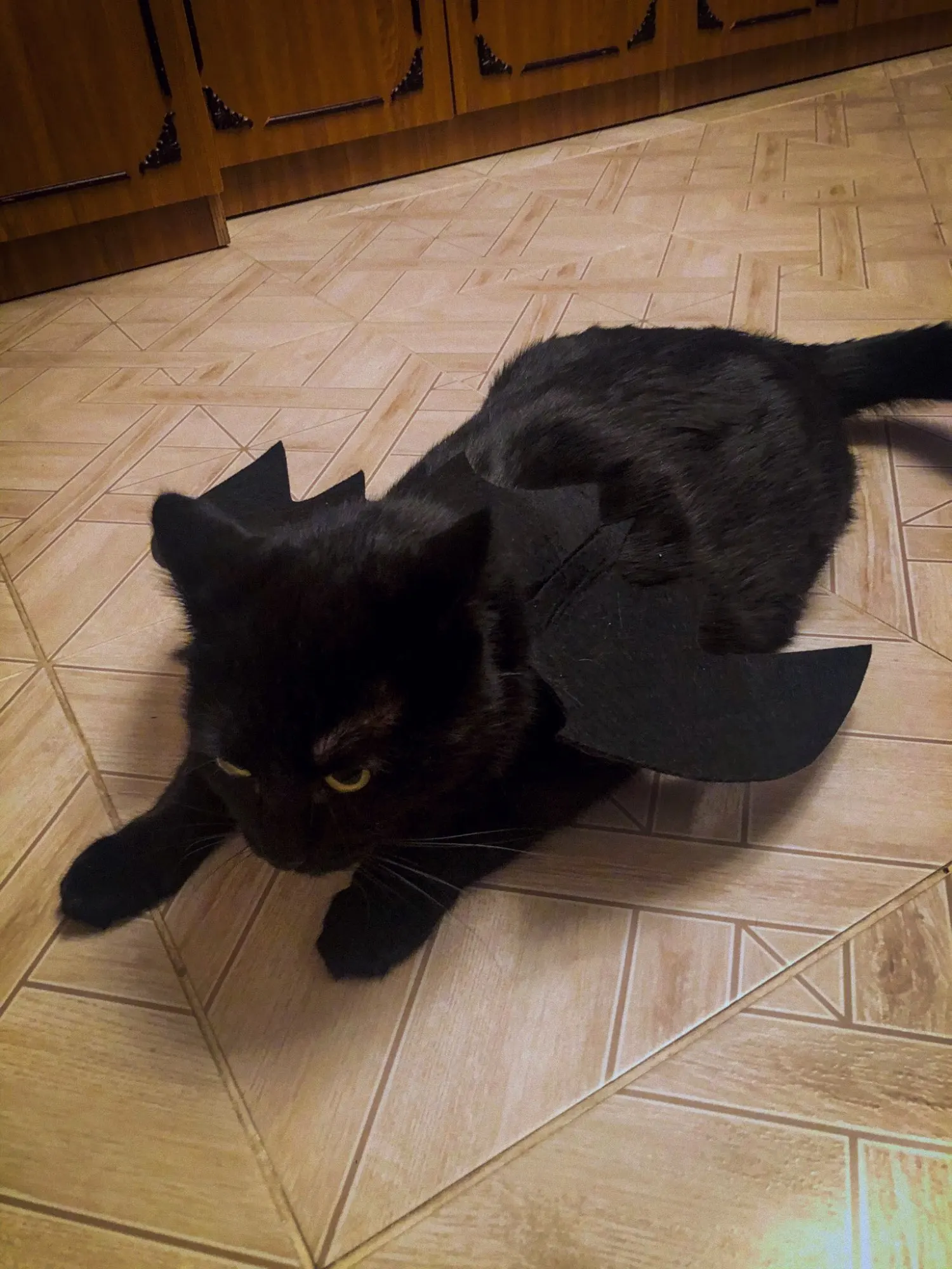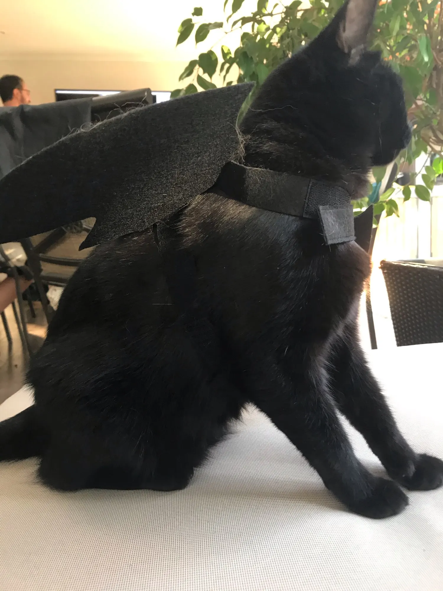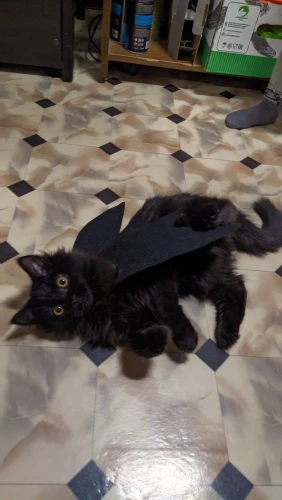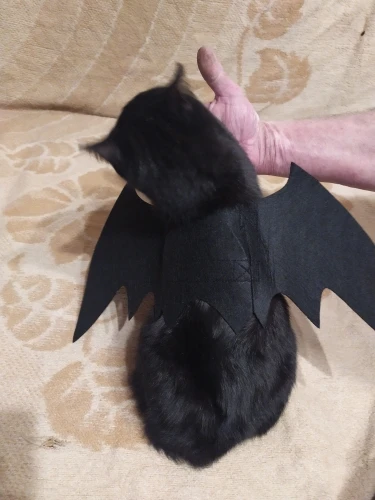 Крылья сделаны из толстого материала, который удерживает форму, они крепятся к телу кошки с двумя полосками на липучке, вокруг шеи и вокруг груди (под передними ногами). Выглядит очень забавно, но вашему кошке это не понравится: D Однако товар и продавец рекомендуются!