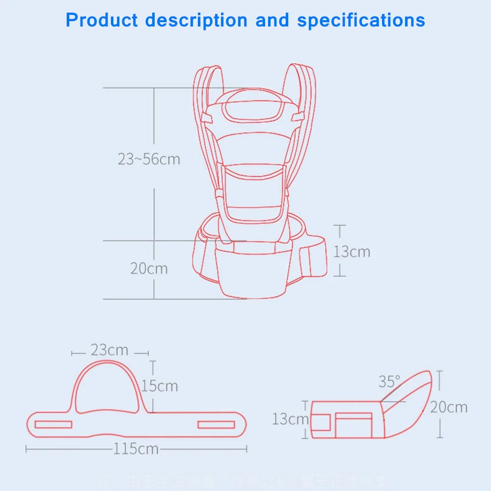 Описание: 1. Ткань: лицевая ткань, хлопок, подкладка из полиэстера 2. Обхват талии: 71-110 см 3. Вес: около 0,78 кг 9 функции: 1. 3 модель использования: одна модель перевозчика, одна модель сиденья Бедра, Комбинированная Модель 2. Подходит для 0-48 месяцев. 4 года, один Перевозчик! 3. 15 видов переноски для 0-48 месяцев 4. С большой емкостью хранения 5. С длинной задней панелью может защитить ребенка от ветра и солнца 6. Длинная задняя панель также может защитить позвоночник ребенка 7. Научный дизайн подушки для предотвращения детских o-ножек 8. Подходит для лета и 4 сезона 9. Красивый цвет для маленьких мальчиков и девочек