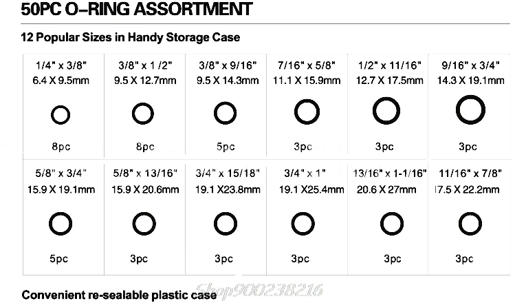 Набор содержит 50 ассорти штук из 12 самых популярных размеров, для использования в сантехнике, гидравлике и воздушно-газовой арматуре