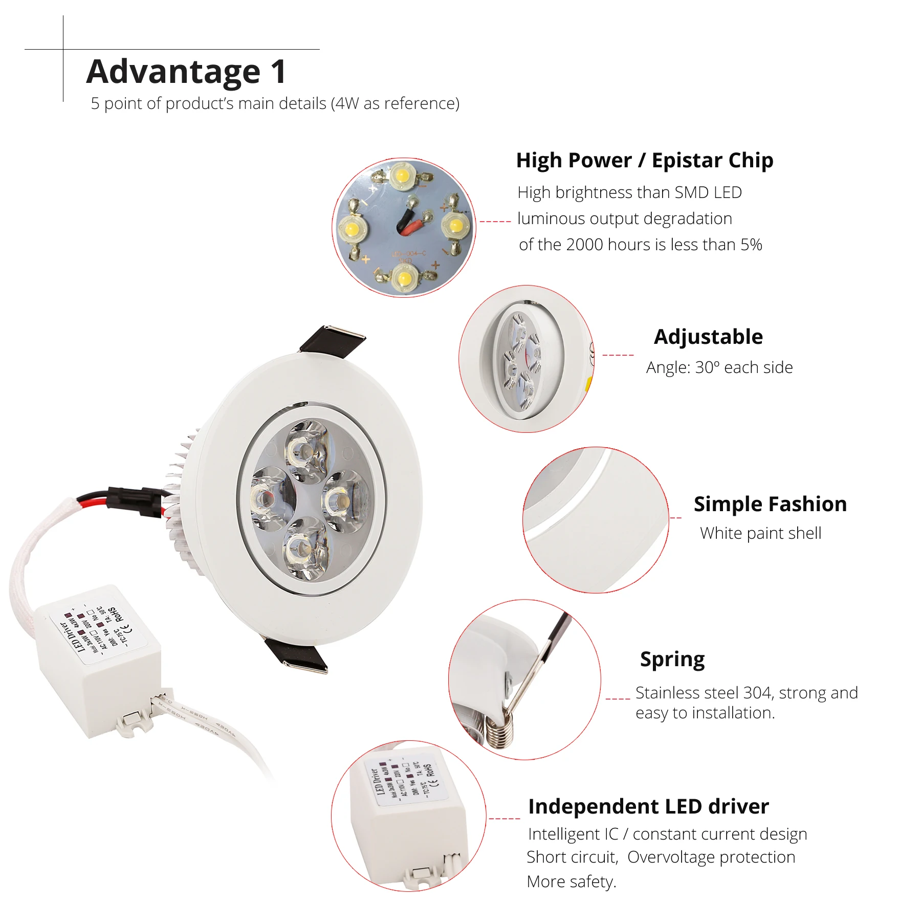 Тип: светильник Обработка лица: белая краска Светодиодный чип: Epstar Мощность: 1 Вт/3 Вт/4 Вт/мини 5 Вт/5 Вт/7 Вт Люмен: 110 лм/Вт Водонепроницаемость: IP44 (доступно для ванной и кухни) Срок службы: 40 000 часов Рабочая температура: от-20 до 65 Индекс цветопередачи (CRI): Ra>85 Установка расстояние: 1,5 м/шт. Энергоэффективность: 85% Длительный срок службы Мгновенный запуск, не мигает Прочный, ударопрочный Экономьте мощность более 90% от обычных ламп Долгое время работы, 12 часов в день идеально, производят низкое тепло Отсутствие радиочастотных помех, отсутствие ртути или других опасных материалов, соответствует RoHs Рабочая среда-20 градусов Цельсия-65 градусов Цельсия, подходит для необычного альпинизма