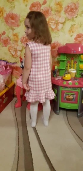 Доставка три недели. Трек отслеживался. Заказала 3т для девочки 2х лет(рост 92). Большеват. Юбка без подворота ниже колен. На фото подвернула два раза. Качество отличное. Как поведёт себя после стирки не знаю.