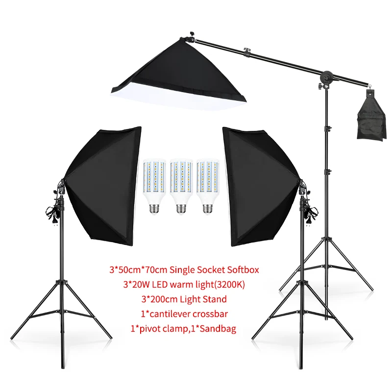 Софтбокс 3*50 см × 70 см с держателем лампы3*20 Вт теплый светодиодный светильник3*2 м светильник-подставка1 * стрела (включая одно колесо и песочница)1 * сумка Оксфорд