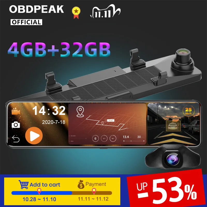 Видеорегистратор-зеркало заднего вида OBDPEAK, 1080P, 4G + 32G, Android 8,1, 12 дюймов, ADAS, Wifi, GPS