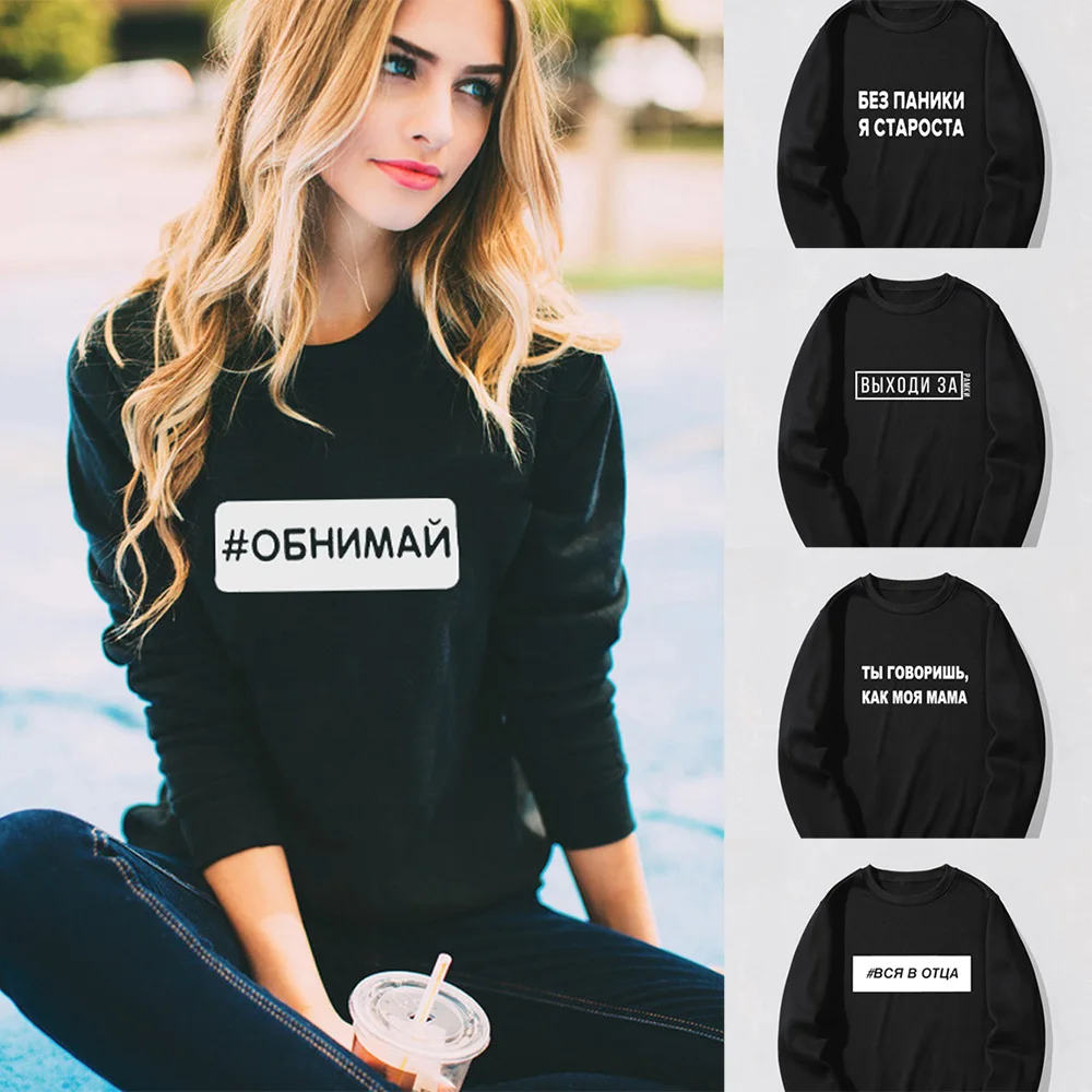 Толстовка женская черная с надписями на русском языке, зима свитшот с круглым вырезом