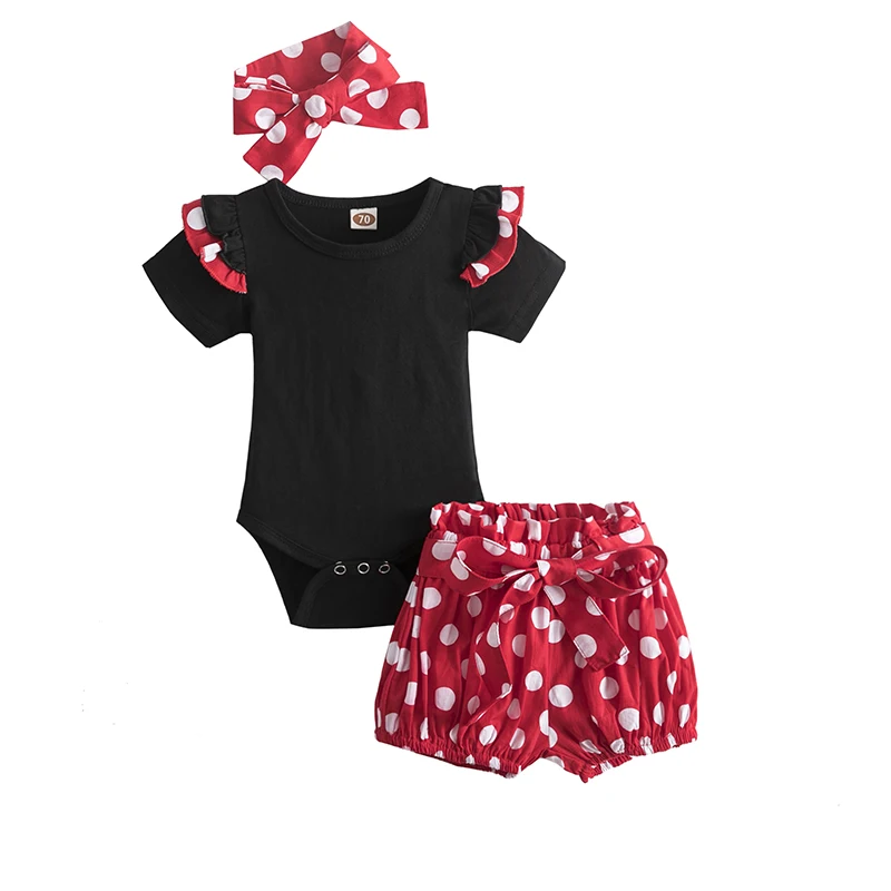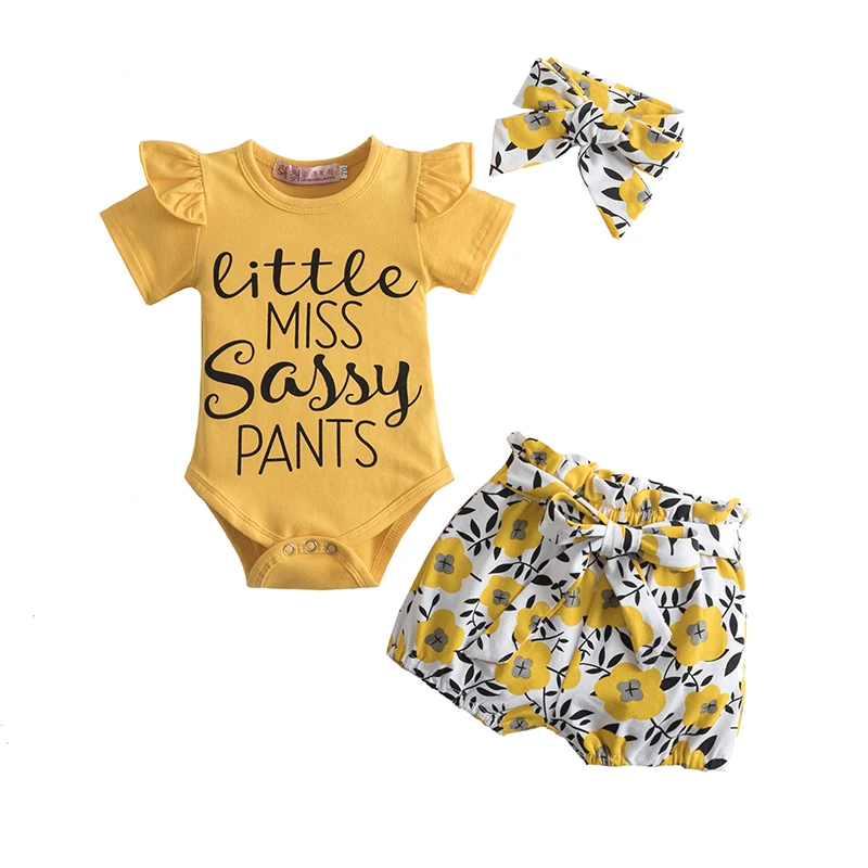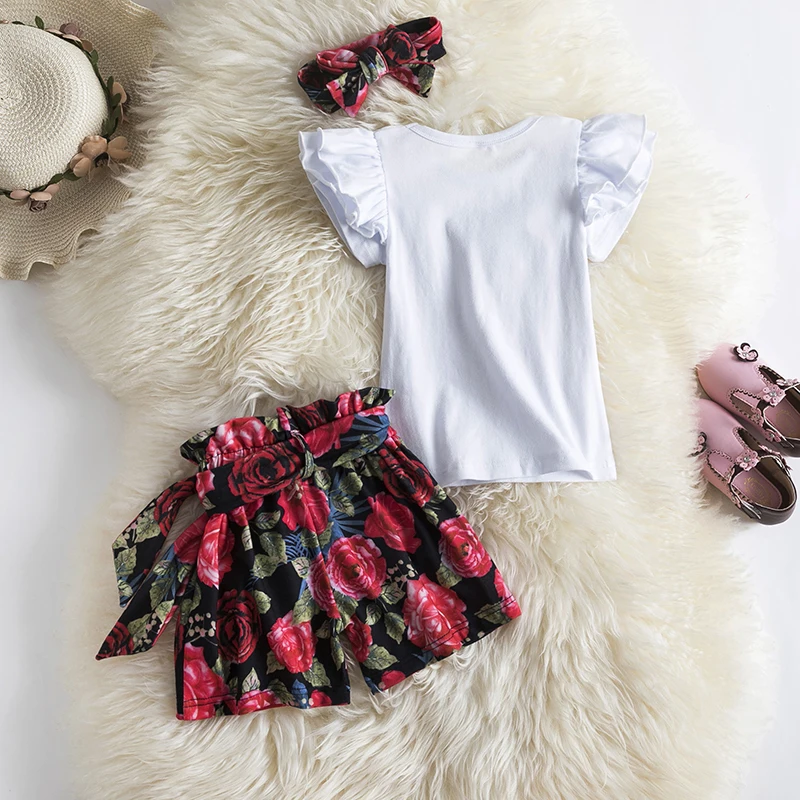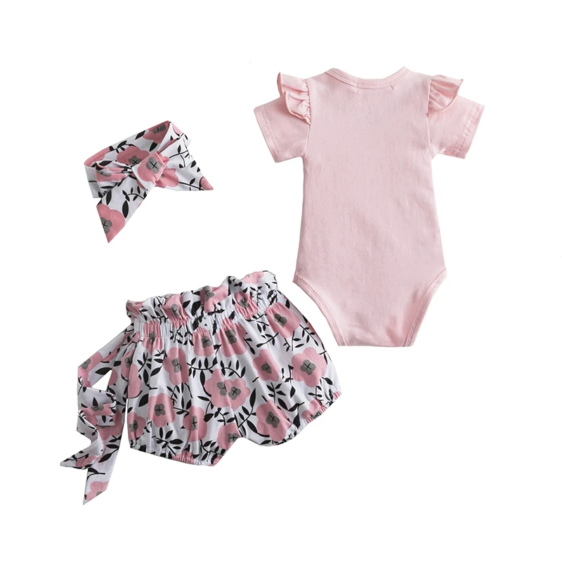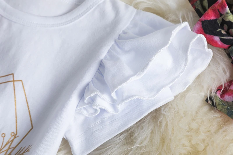 Летняя одежда для маленьких девочек комплект хлопковой одежды, Детский костюм, футболка с короткими рукавами с рюшами для малышей Топы и укороченные штаны с цветочным принтом повязка на голову, 3 предмета в комплекте, для маленьких детей, новорожденных