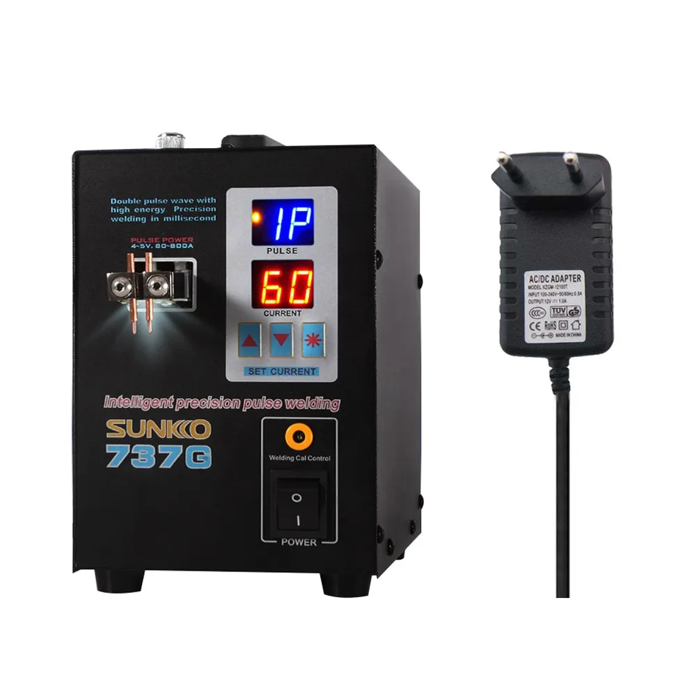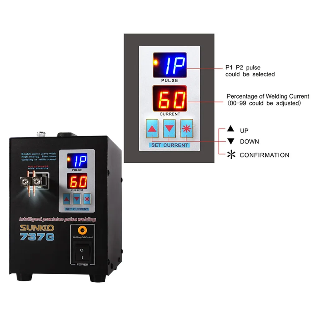 Параметры сварки точечного сварочного аппарата отображаются на цифровом дисплее светодиодный индикатор, и контроль более точен. Двухконтактное независимое регулируемое давление, сварка более надежная. Особенности: Двойная импульсная волна с высокой энерготочностью сварки в миллисекундах. Ножная Педальная Сварка подходит для производства количества. Режим пуш-ап сварки, сборка небольшого размера аккумуляторной батареи. Подвижная сварочная ручка собирает большой аккумулятор. Портативная ручка, удобная для переноски. Сварочное давление может быть отрегулировано от 200 г-700 г для сварки различной толщины заготовки для получения хорошего места сварки. Контроль калибровки сварки, более точная сварка, более быстрота сварки. Фиксированная сварочная головка. Улучшенный светодиодный светильник легко светильник для сварки. Технические характеристики: Модель: 737G, 737B (опционально) Входное напряжение: 110 В переменного тока/220 В ± 10 в Первичный ток: 2A-15A Сварочный ток: 50A-800A Сварочное давление: 200 г-700 г 1 Пульс: 0,05-0,12 мм 2 импульса: 0,12-0,2 мм Мощность точечного сварщика: 1500 Вт Диапазон толщины сварки: 0,05-0,2 мм Размер товара: 24,5*20*14 см/9,6*7,9 * 5.5in Вес изделия: 4300 г/9.5lb Посылка Размеры: 37*31*21,5 см/14,6*12,2 * 8.5in Посылка Вес: 4930 г/10.9lb Посылка список: 1 * машина 1 * Руководство пользователя 1 * шестигранный ключ, дюймовый стандарт 2 * плавкая вставка 2 * пара сварочных штифтов 1 * Педаль переключатель 1 * Батарея держатель 60 * Никель образца